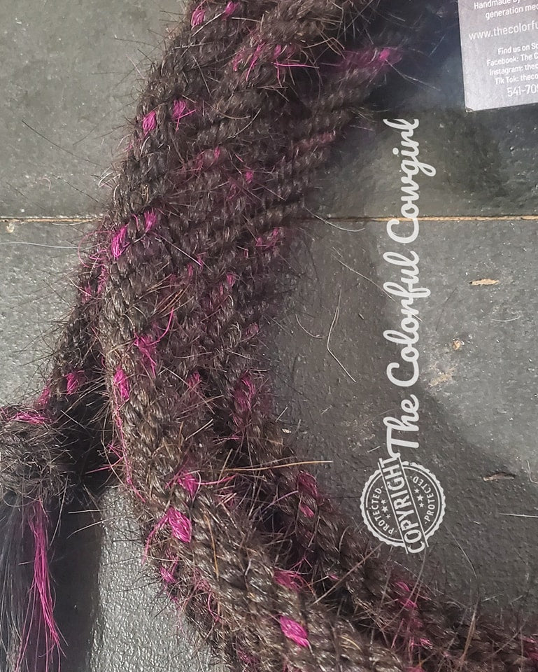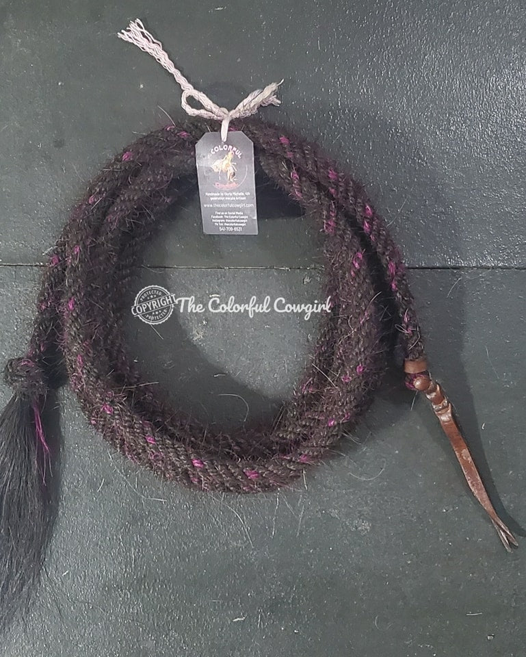 Gorgeous mane hair mecate Five-eighths x 22' in black with hints of beautiful raspberry.
