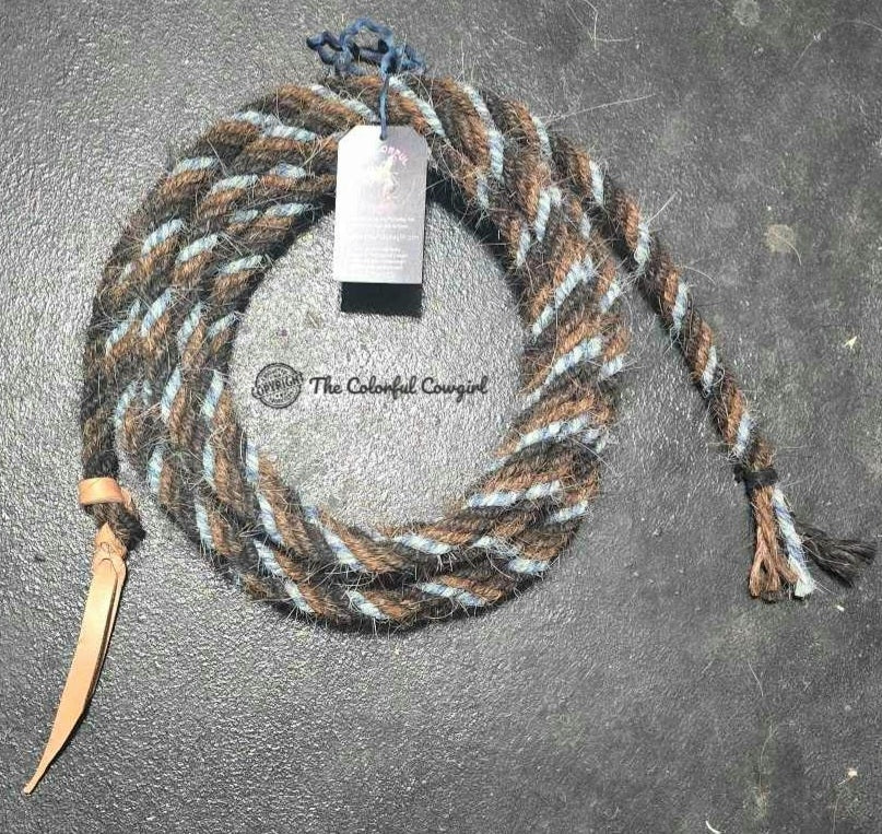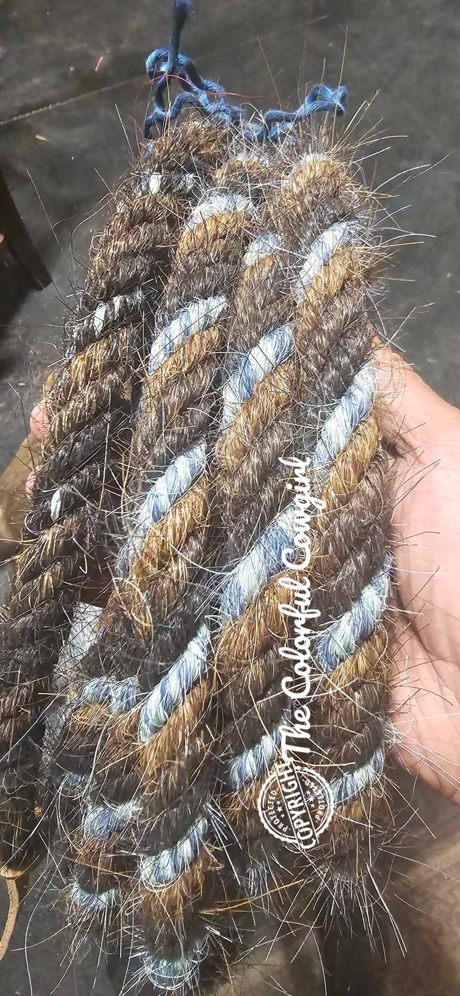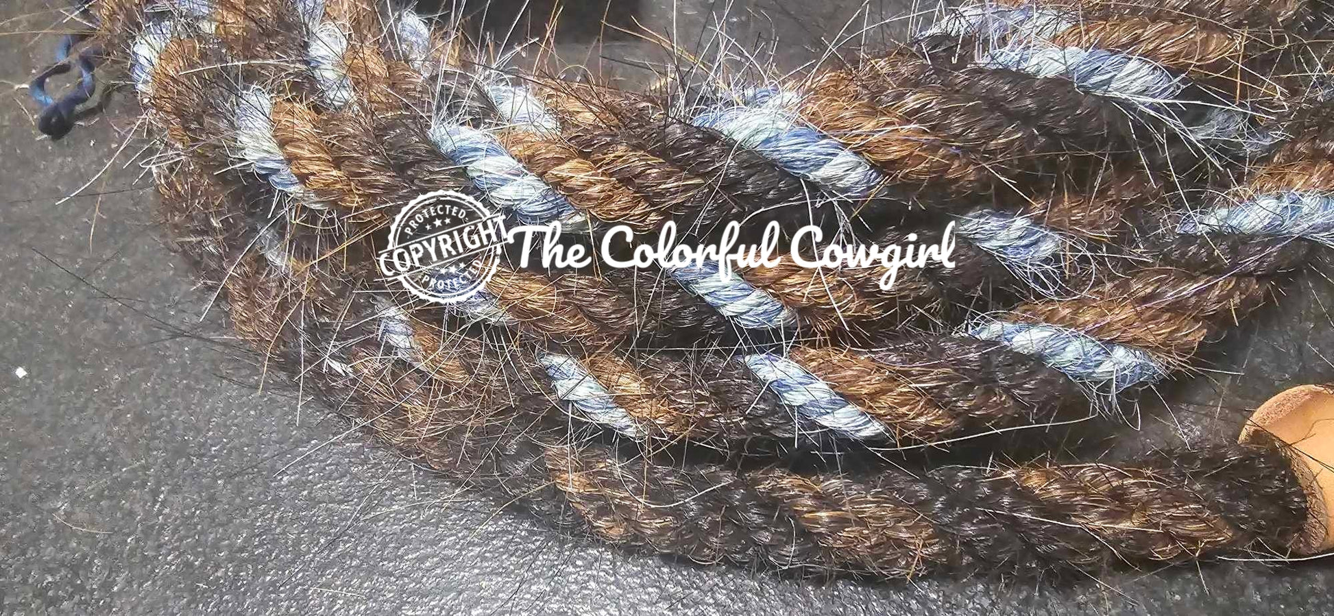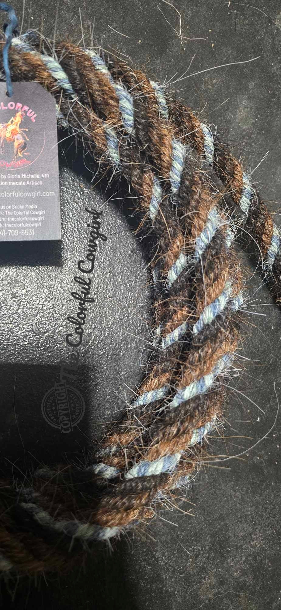 Gorgeous mane hair five eighths mecate in black and sorrel with a touch of blue and turquoise. 5/8 in diameter, and it can be finished to the length you want up to 22'.