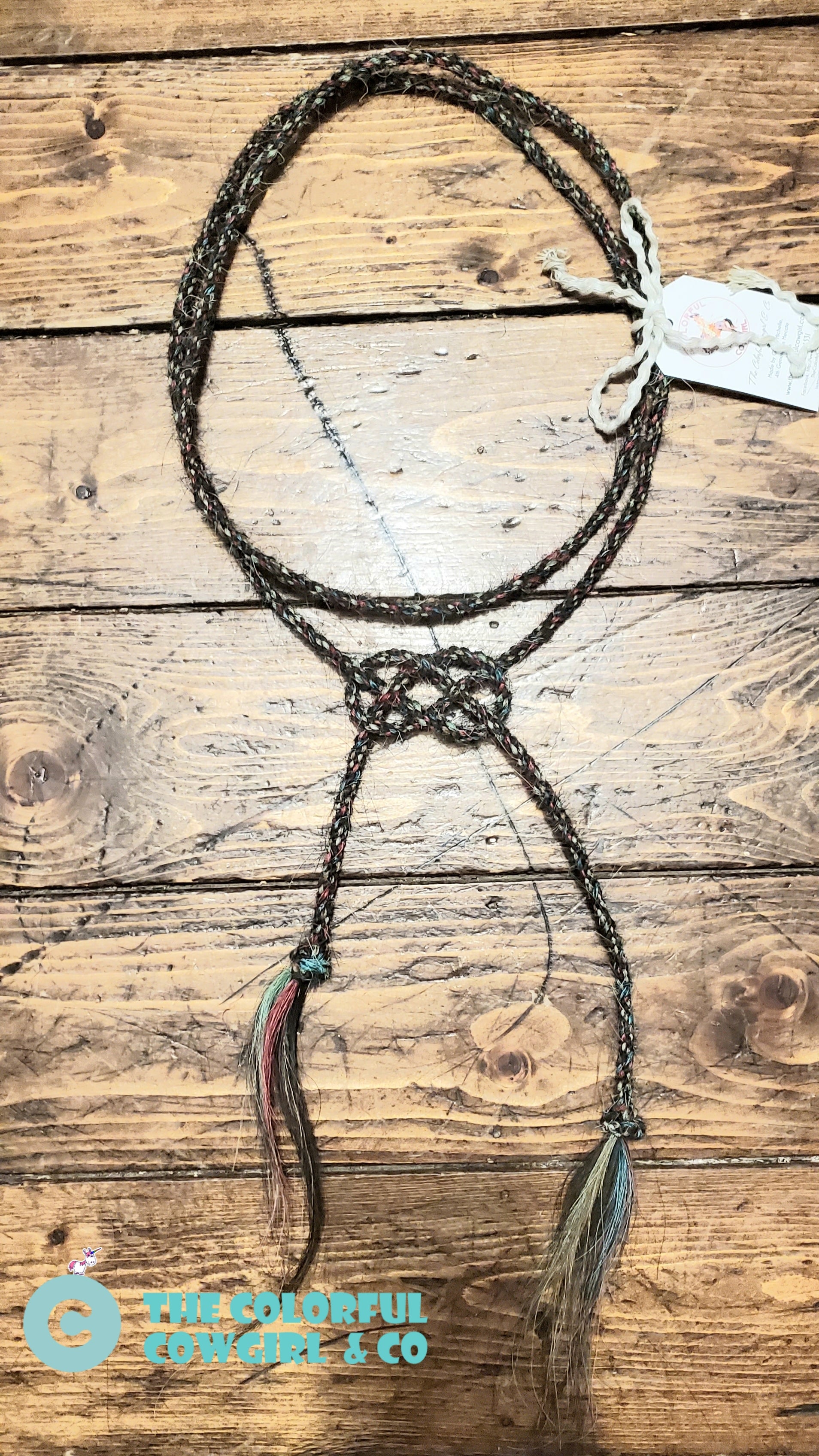A short piece of mecate with your horses mane or tail incorporated into it, then tied into a beautiful traditional Californio alamar knot.