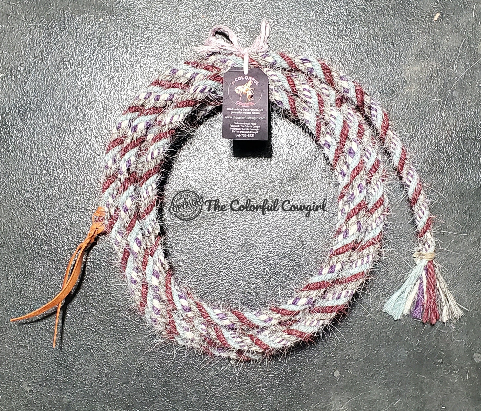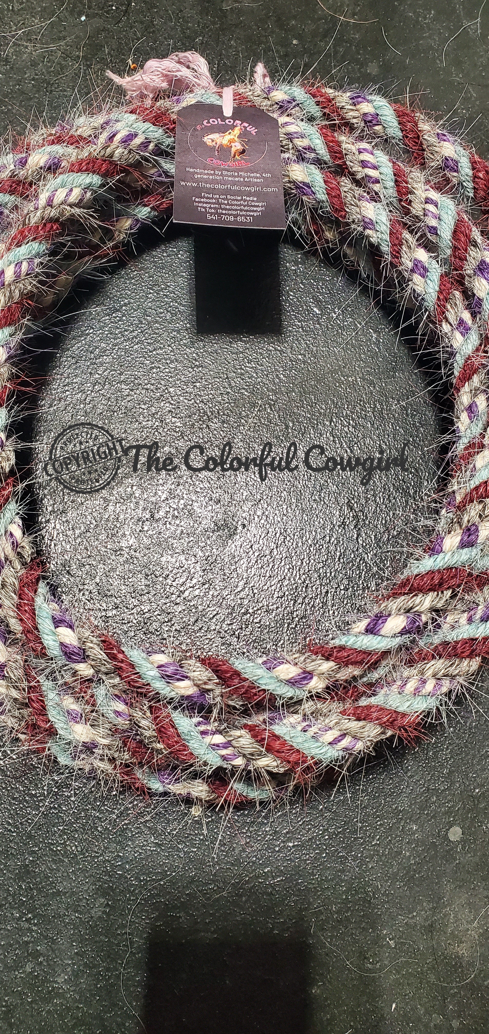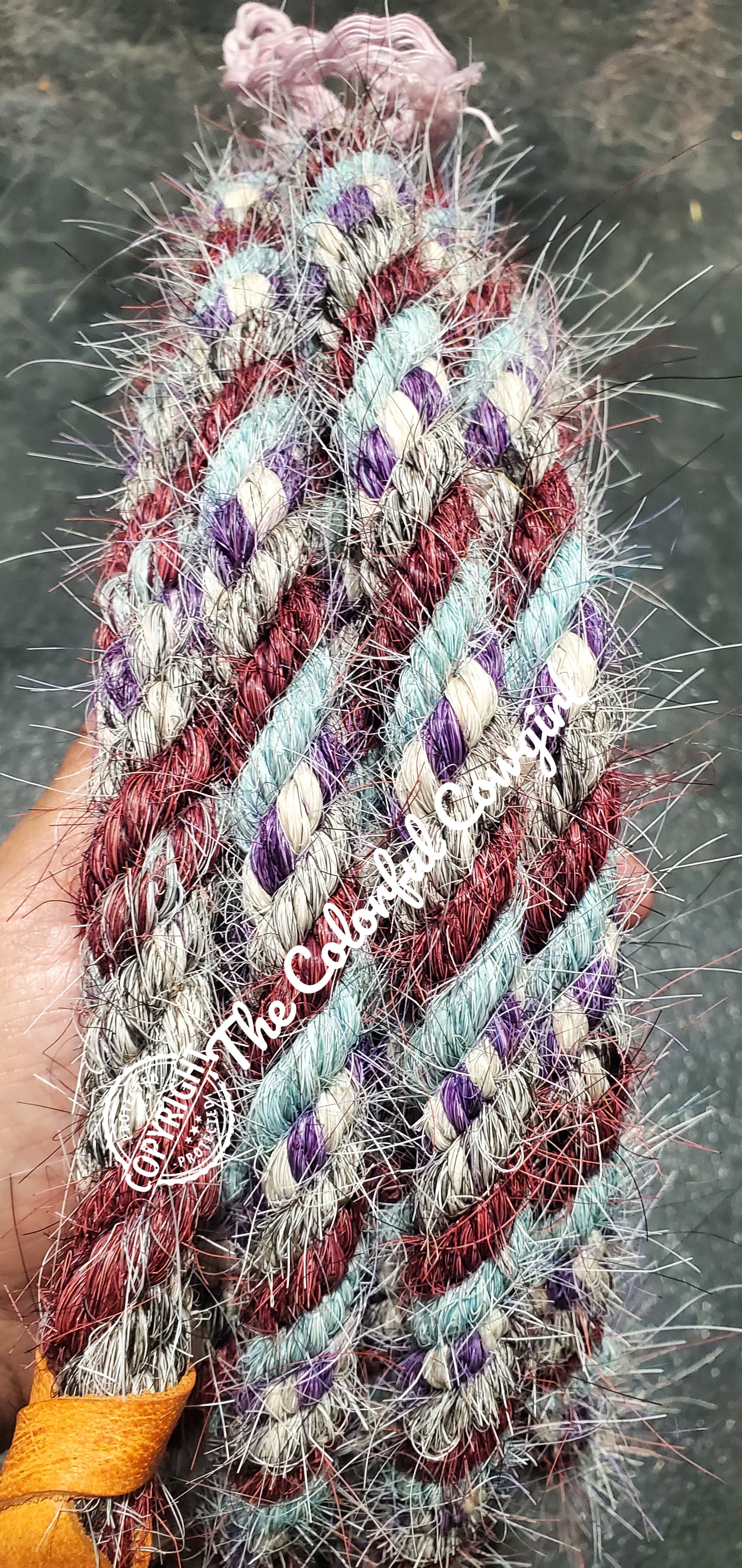 Gorgeous mane hair mecate in burgundy, turquoise, purple, grey, and white. Five-eighths in diameter, and can be finished to the length you want up to 22'.