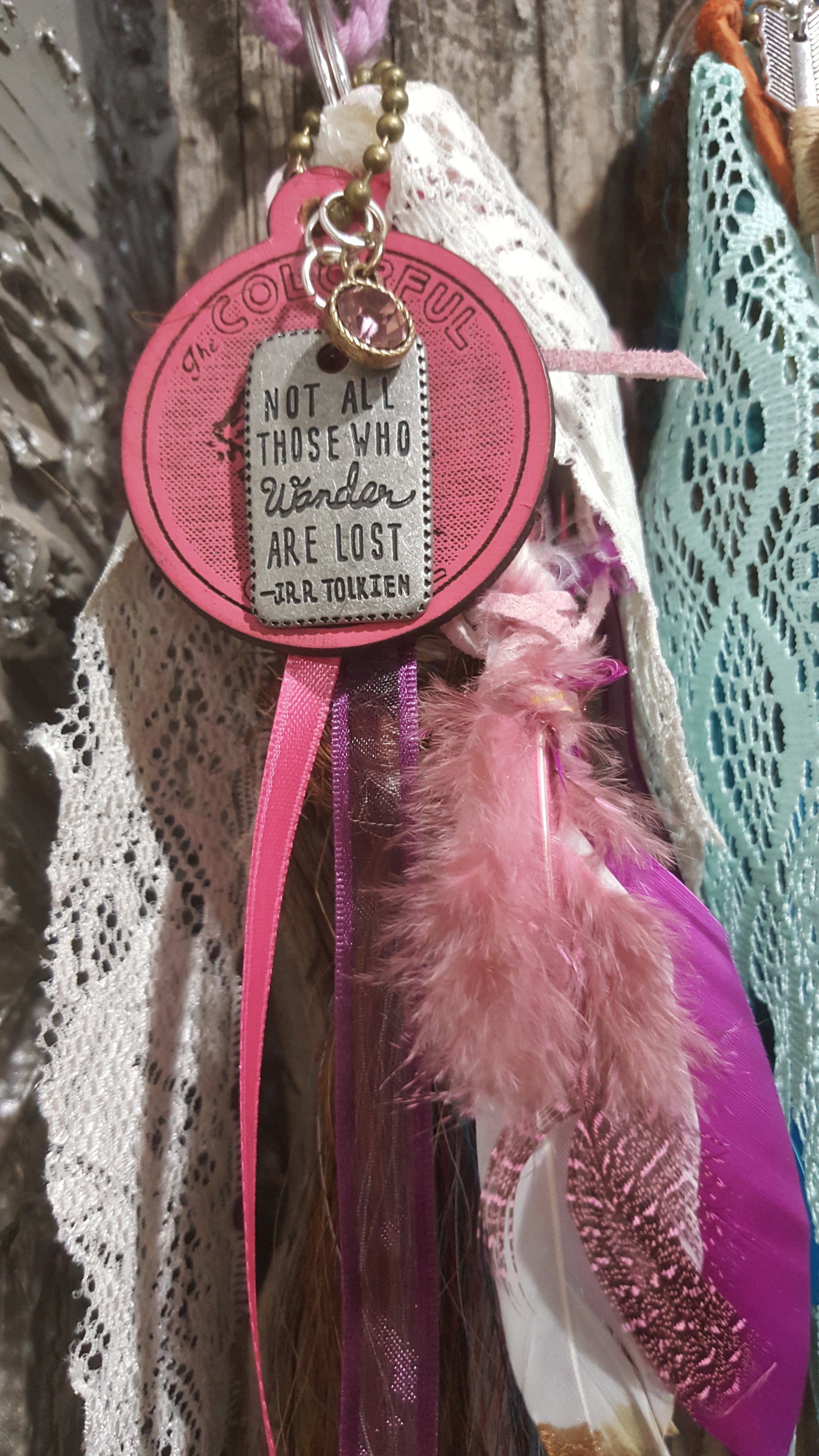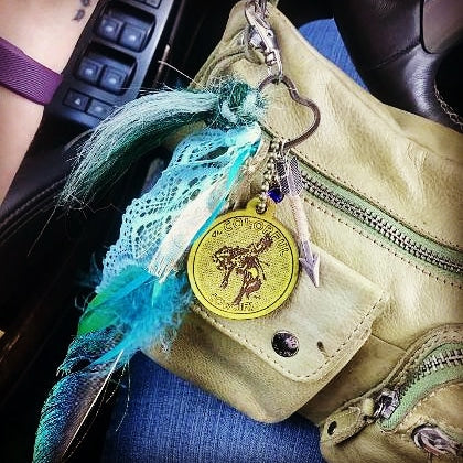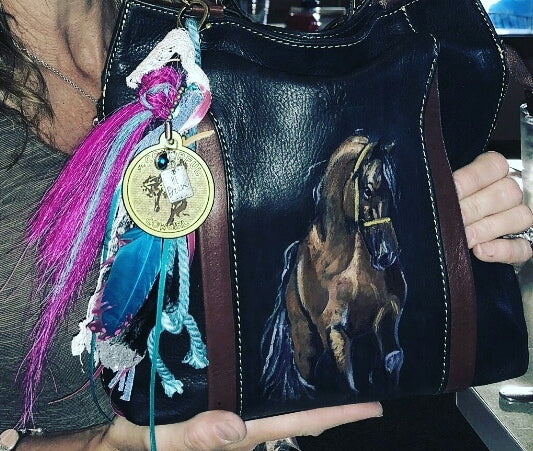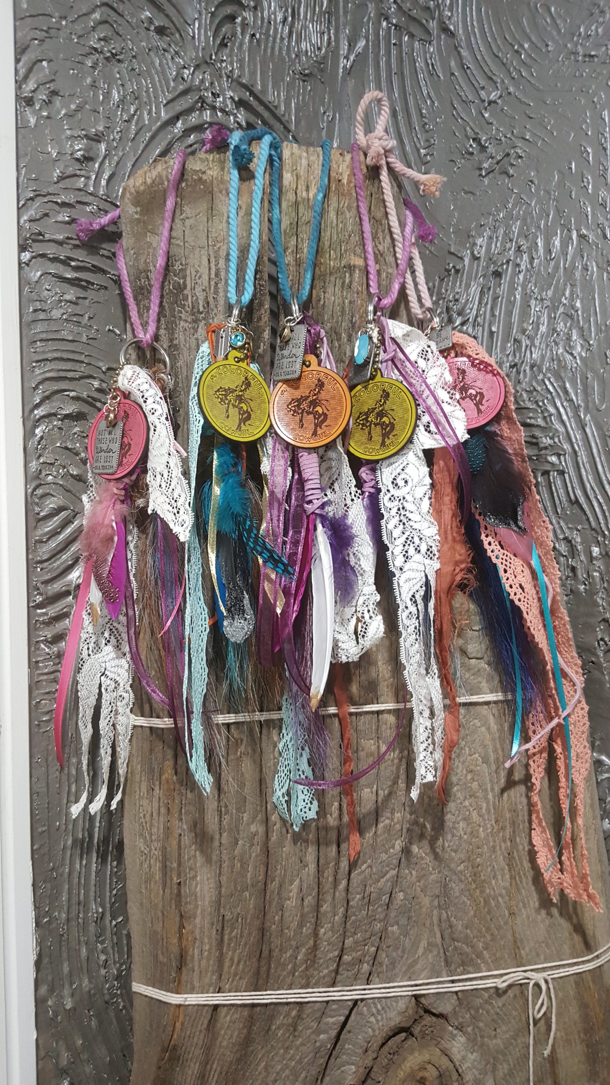 Fun colorful cowgirl tassels embellished with all kinds of fun stuff like feathers, leather, lace, ribbon, rhinestones, charms. They can be a keychain, saddle tassel, purse tassel, mirror hanger, or whatever you want. They are made with a key ring, and a snap.