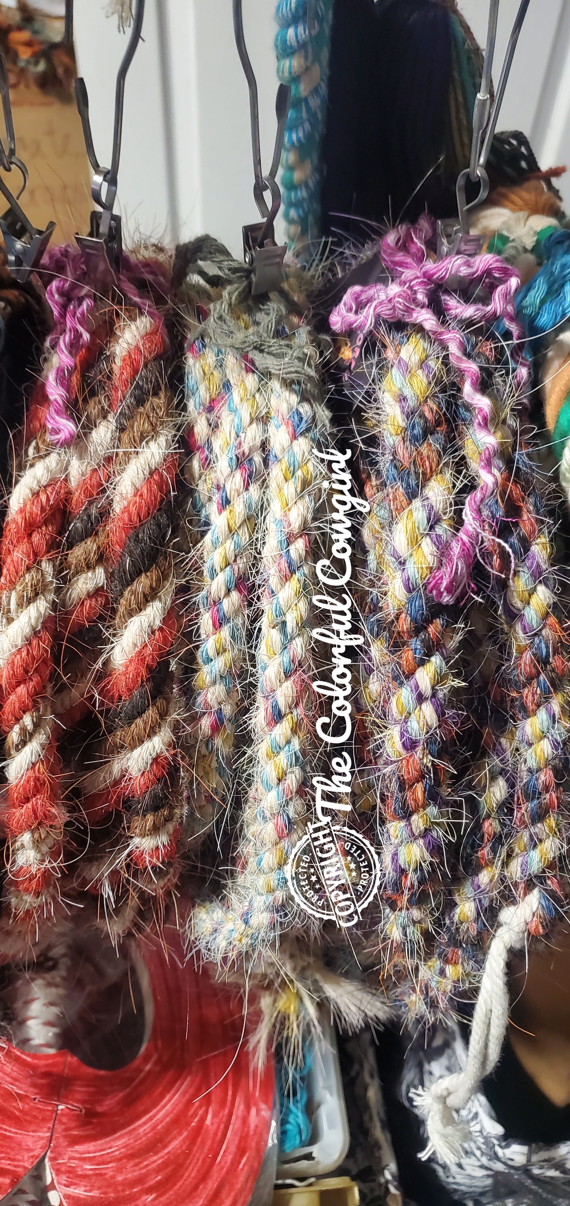 A five eighths mane hair loop rein in a boho mix of mostly the cool colors on the color chart.