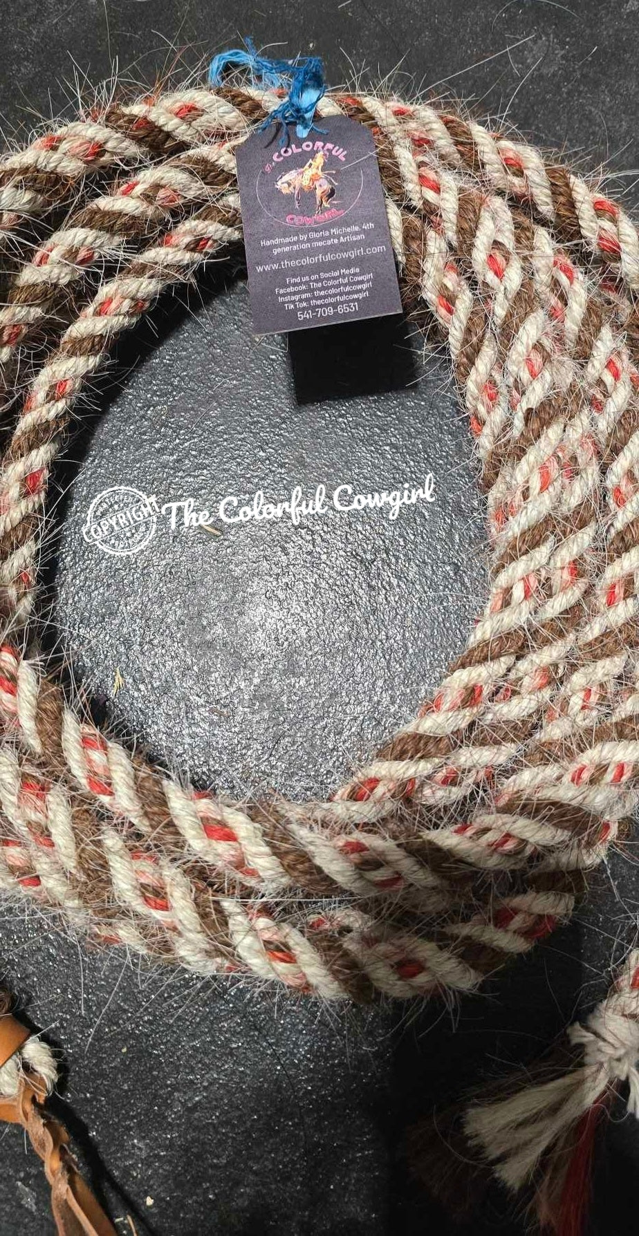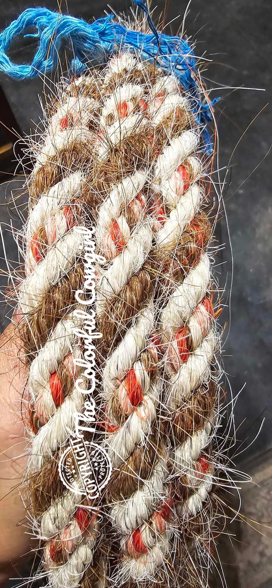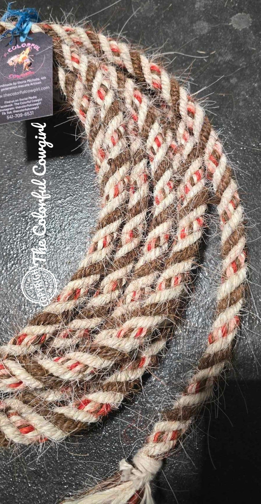 Gorgeous mane hair mecate in white and sorrel, with a red, and peach mix. Five-eighths in diameter, and can be finished to the length you want up to 22'.