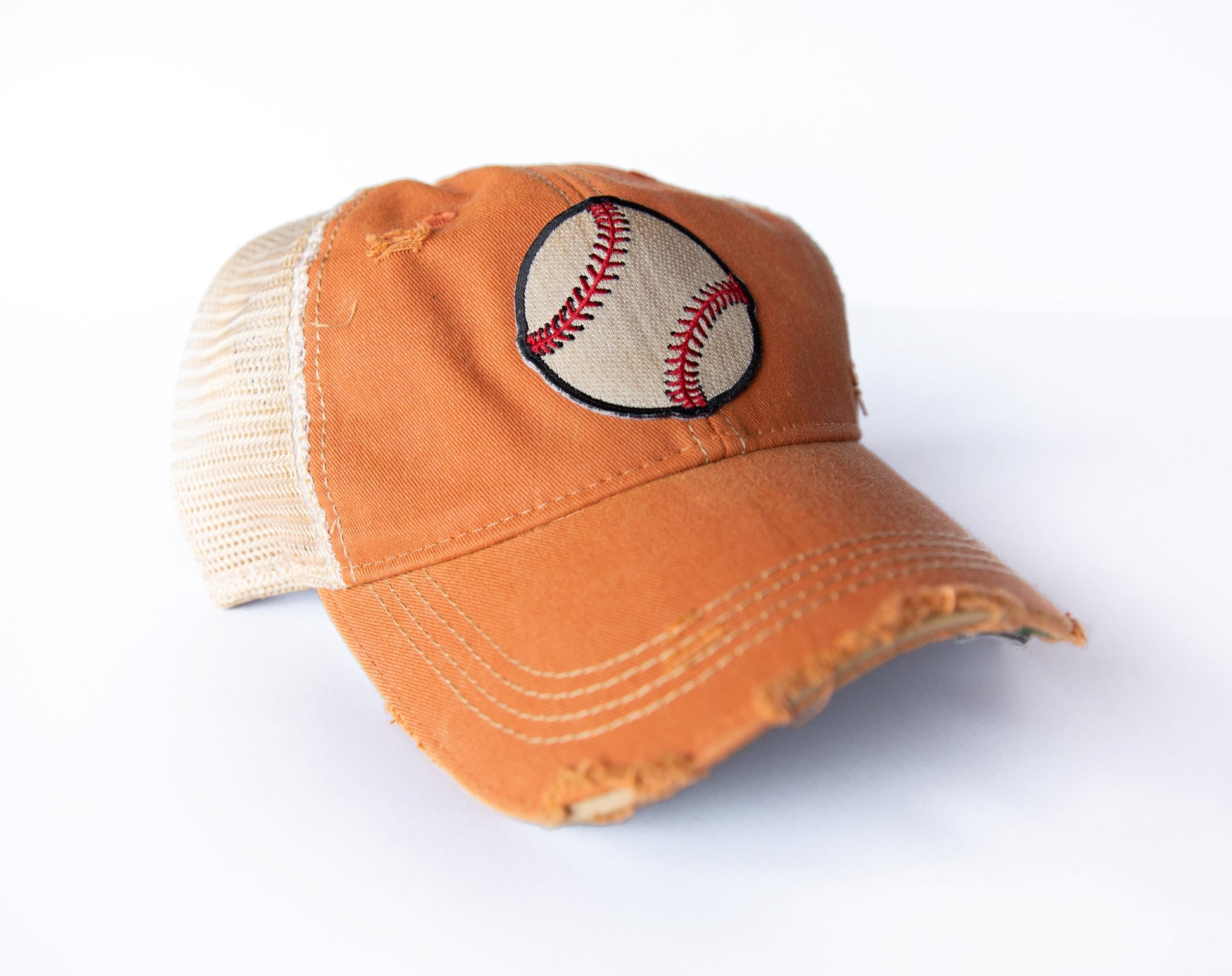 Classic vintage style with soft mesh back with embroidered patch and distressed contrast stitching on distressed vintage look canvas.