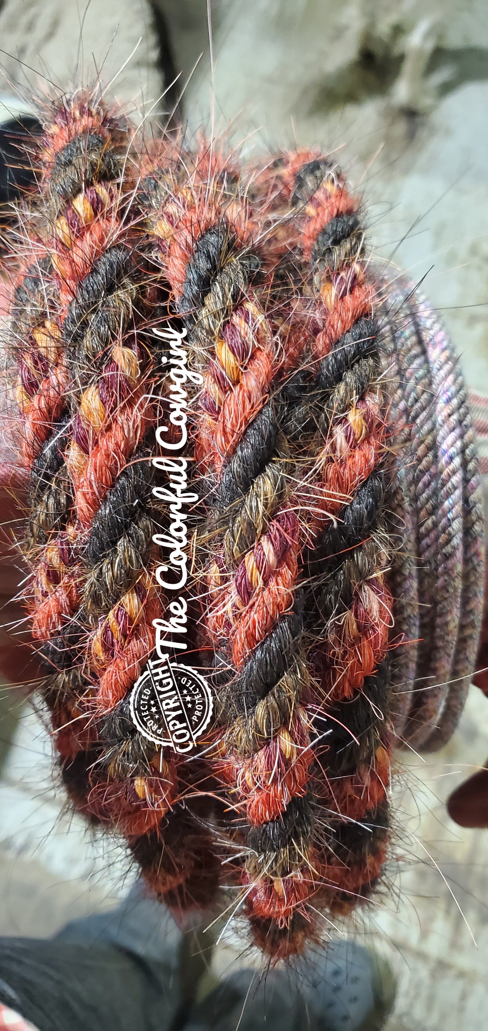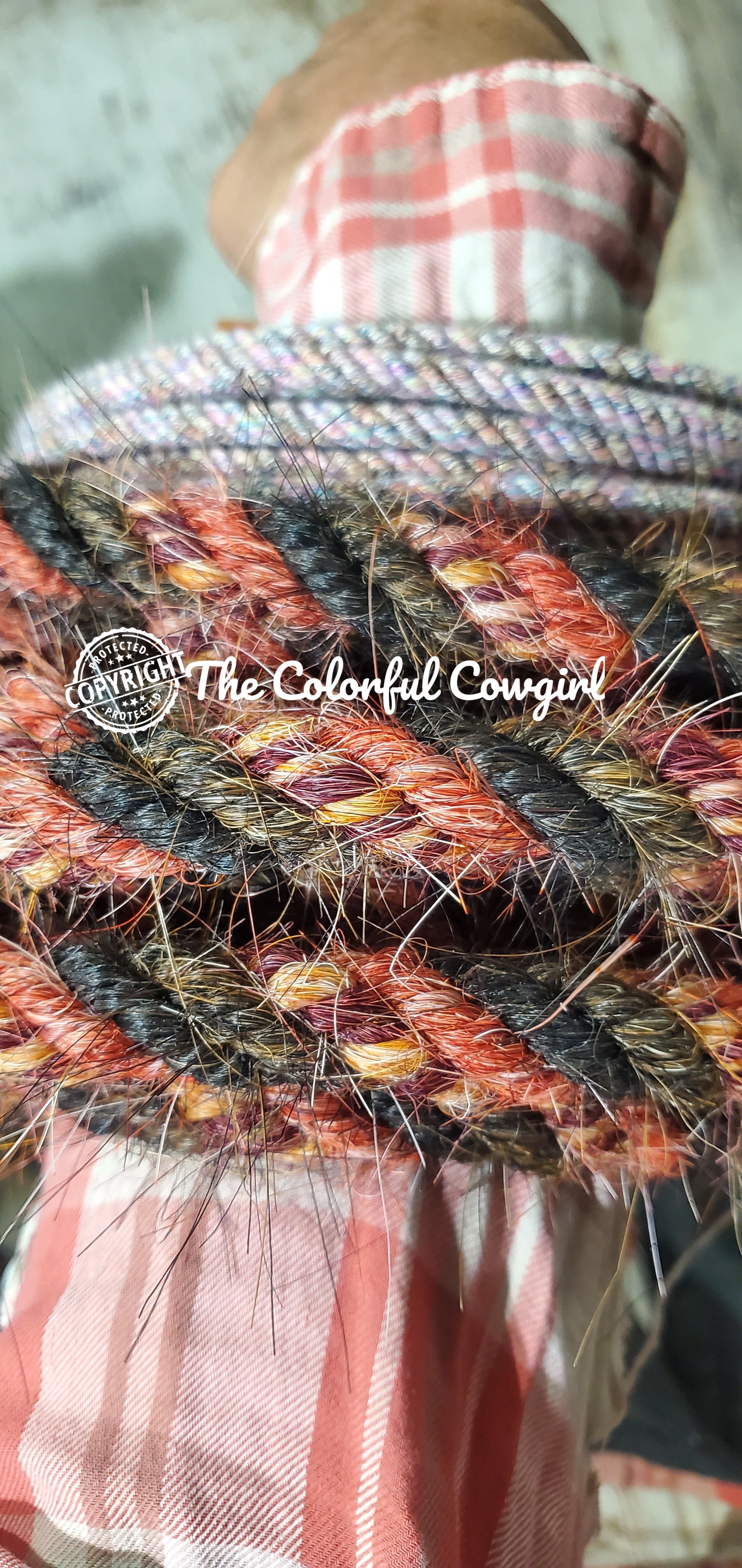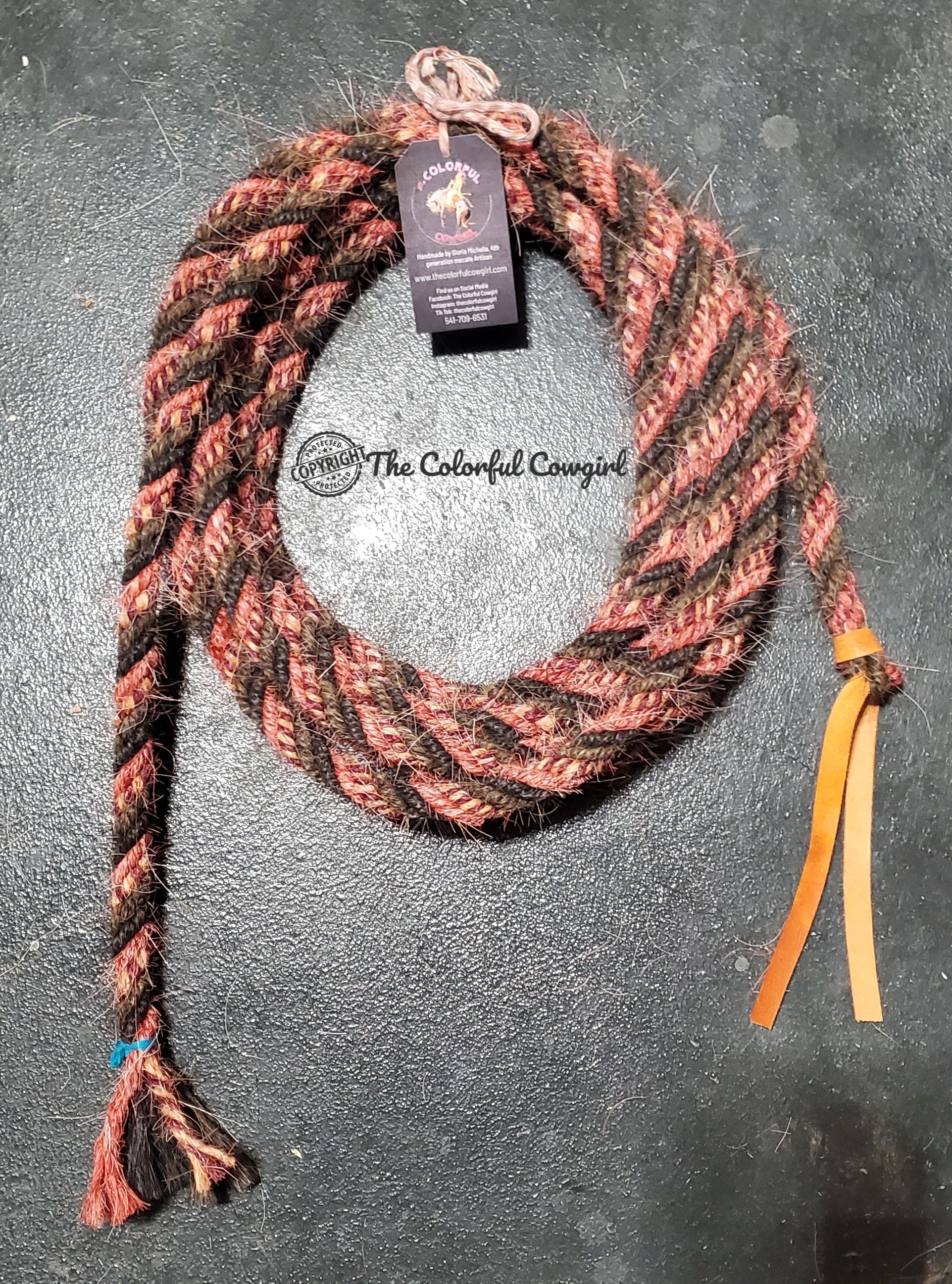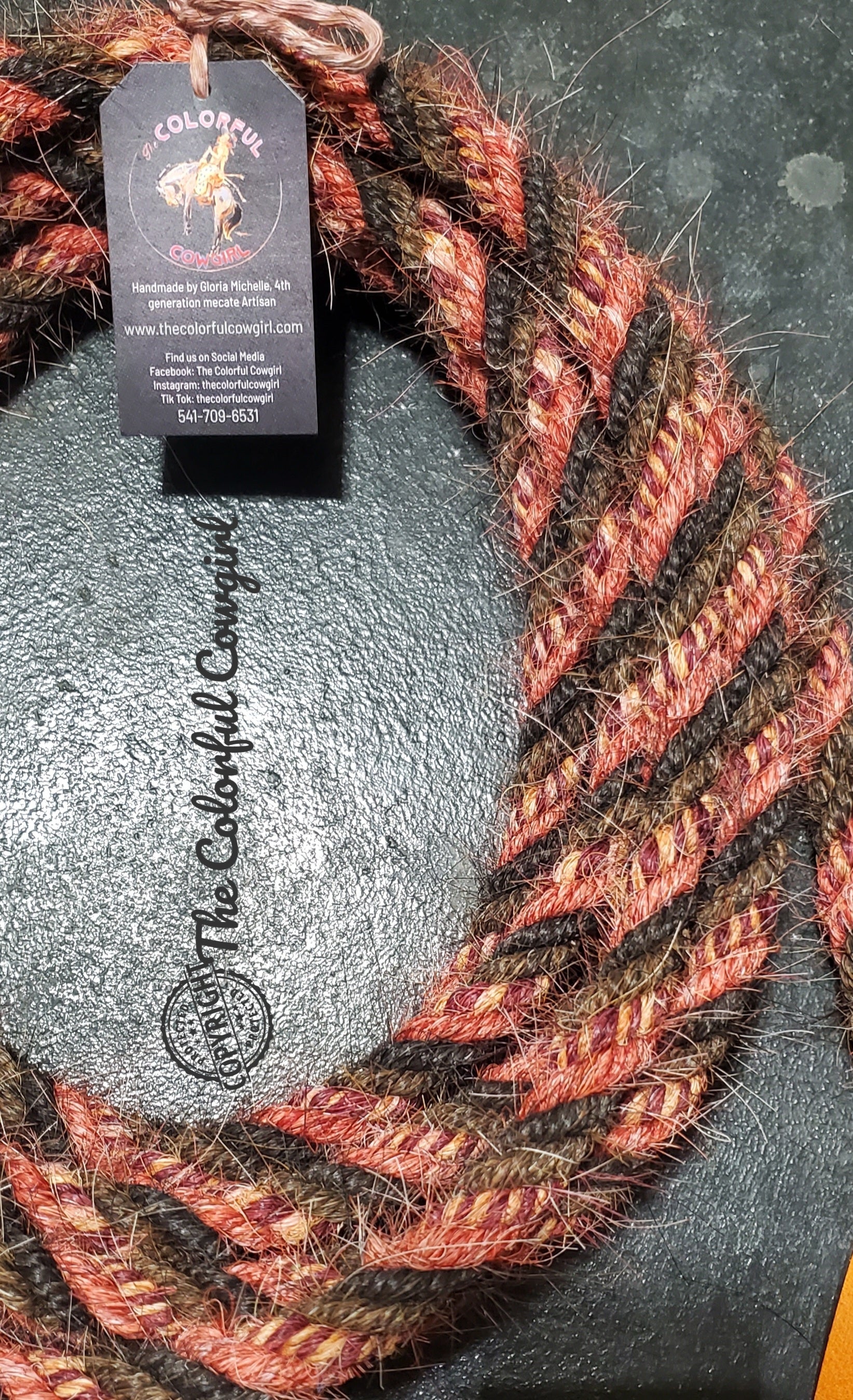 Meet Elvira, the stunning 5/8 mane hair mecate in burgundy, red, salmon, dark brown, and black. Can be finished to the length you want up to 22'.