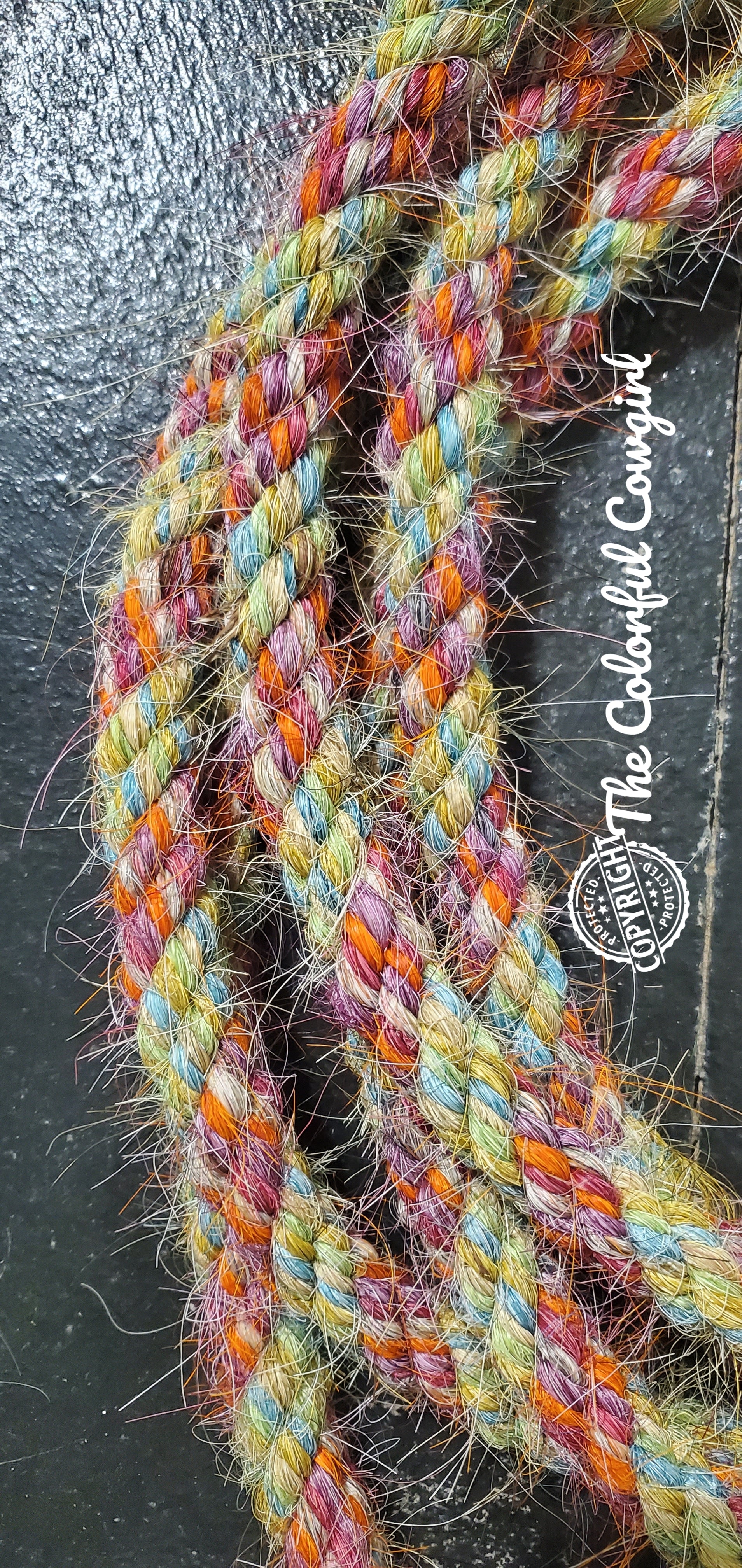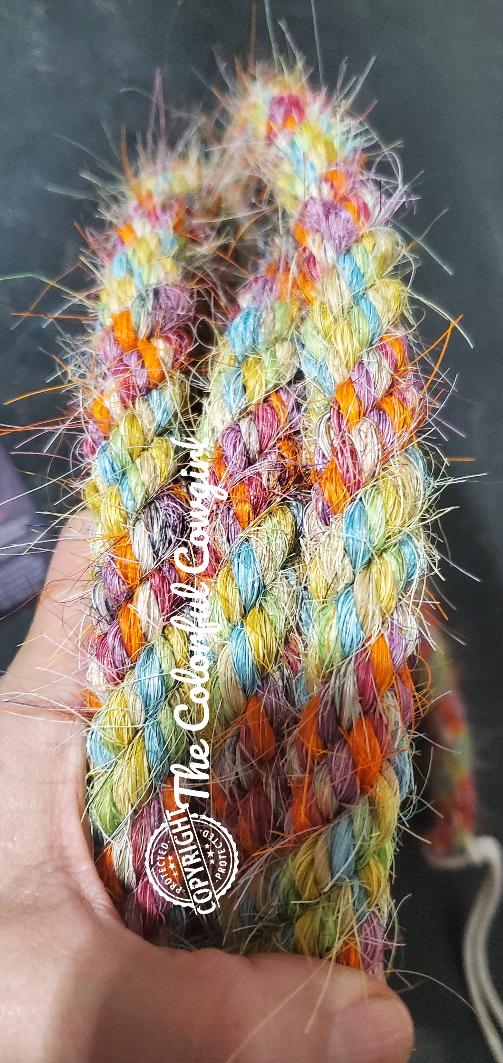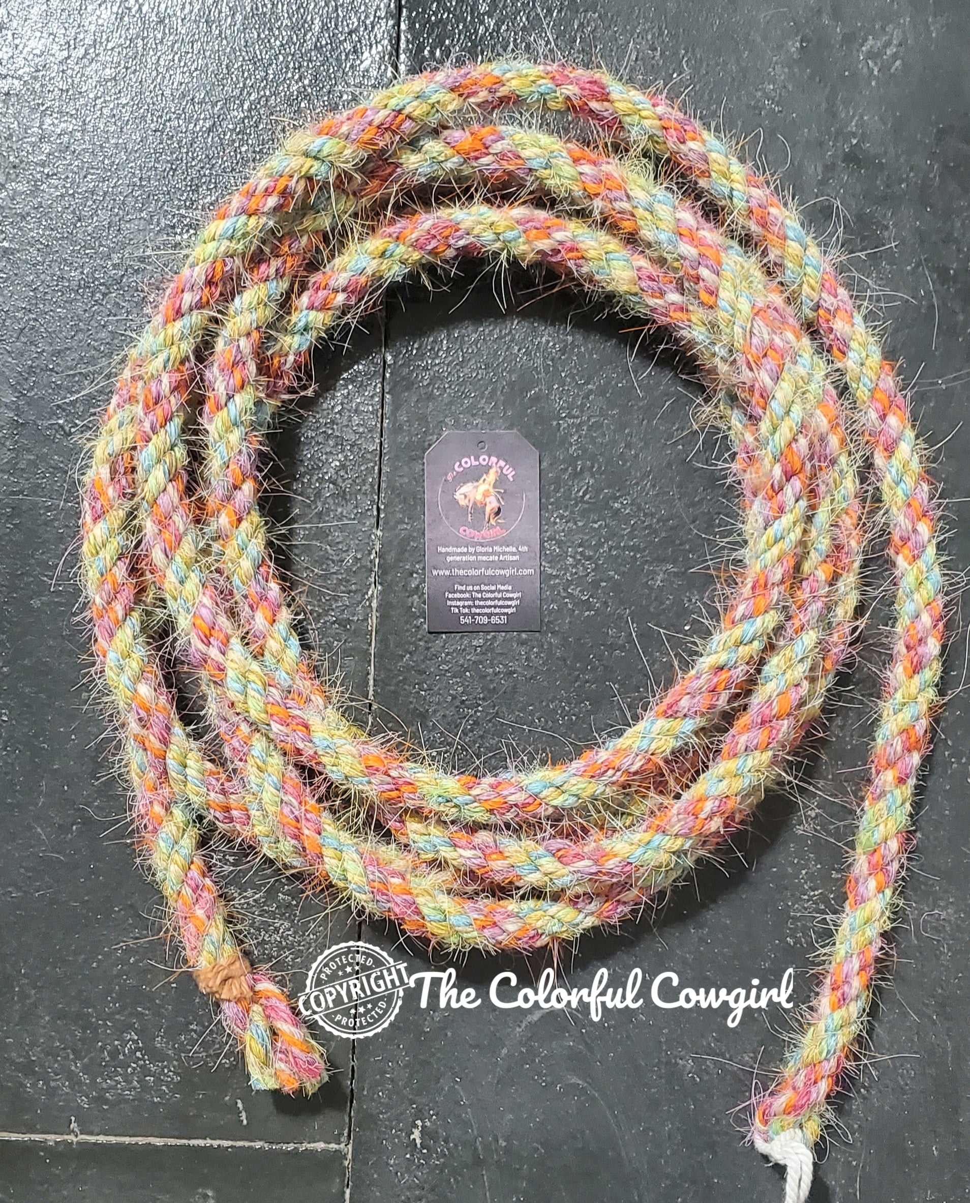Gorgeous five-eighths mane hair mecate loop rein in some bright colors reminiscent of the cereal Fruity Pebbles. It can be finished to the length that you want up to 12'.