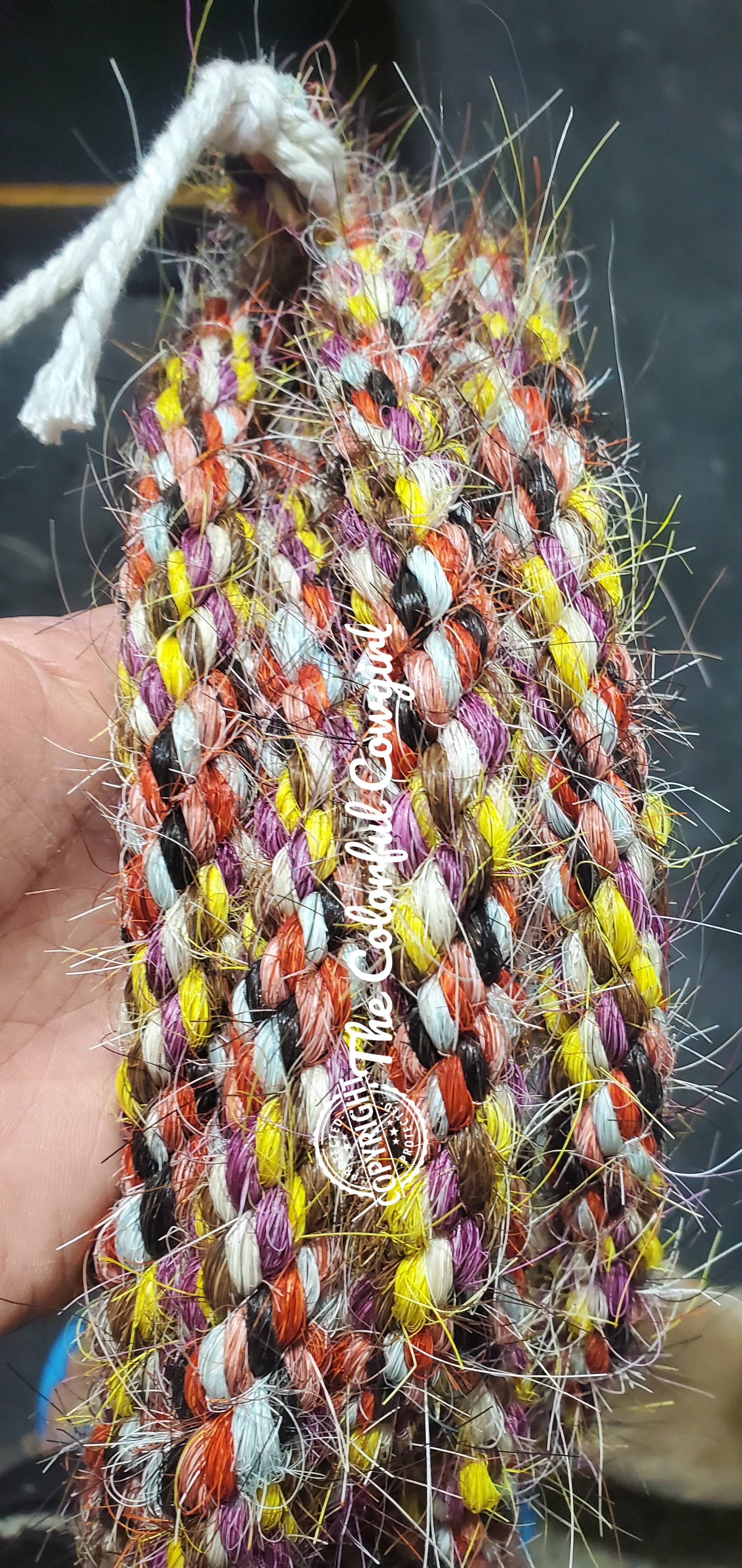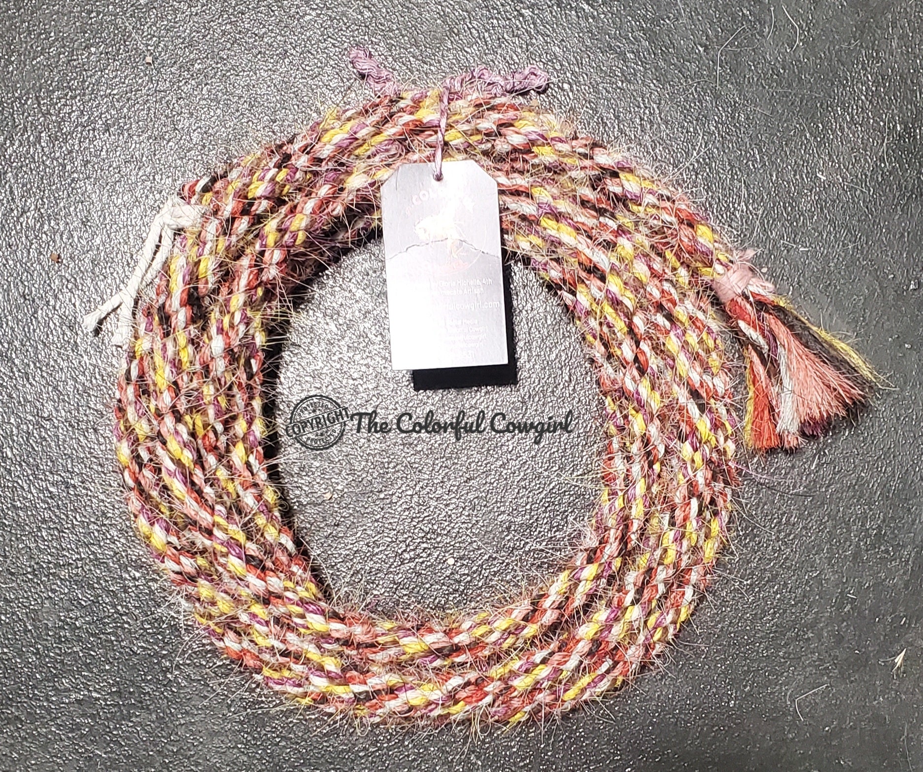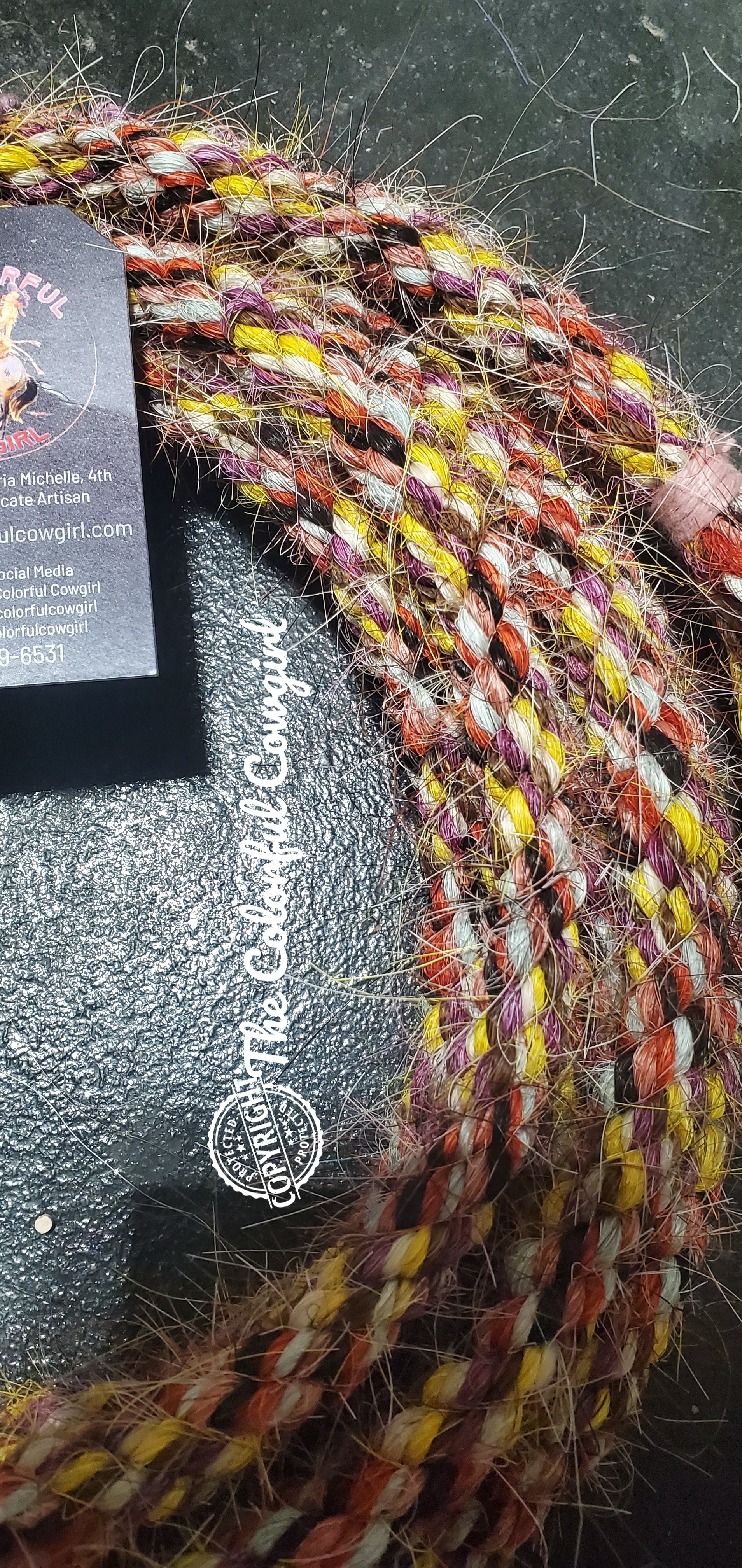 Gorgeous mane hair loop rein in white, yellow, purple, aqua, red, orange and black mix. Five-eighths in diameter, and can be finished to the length you want up to 10'.