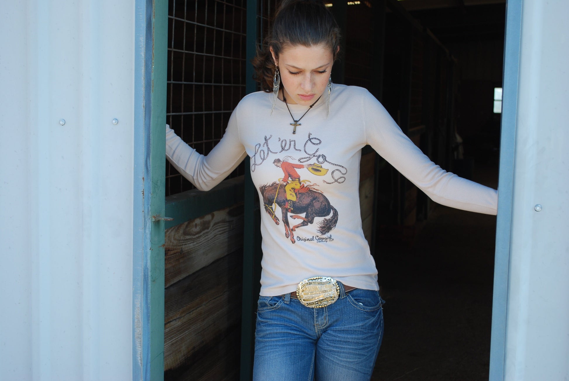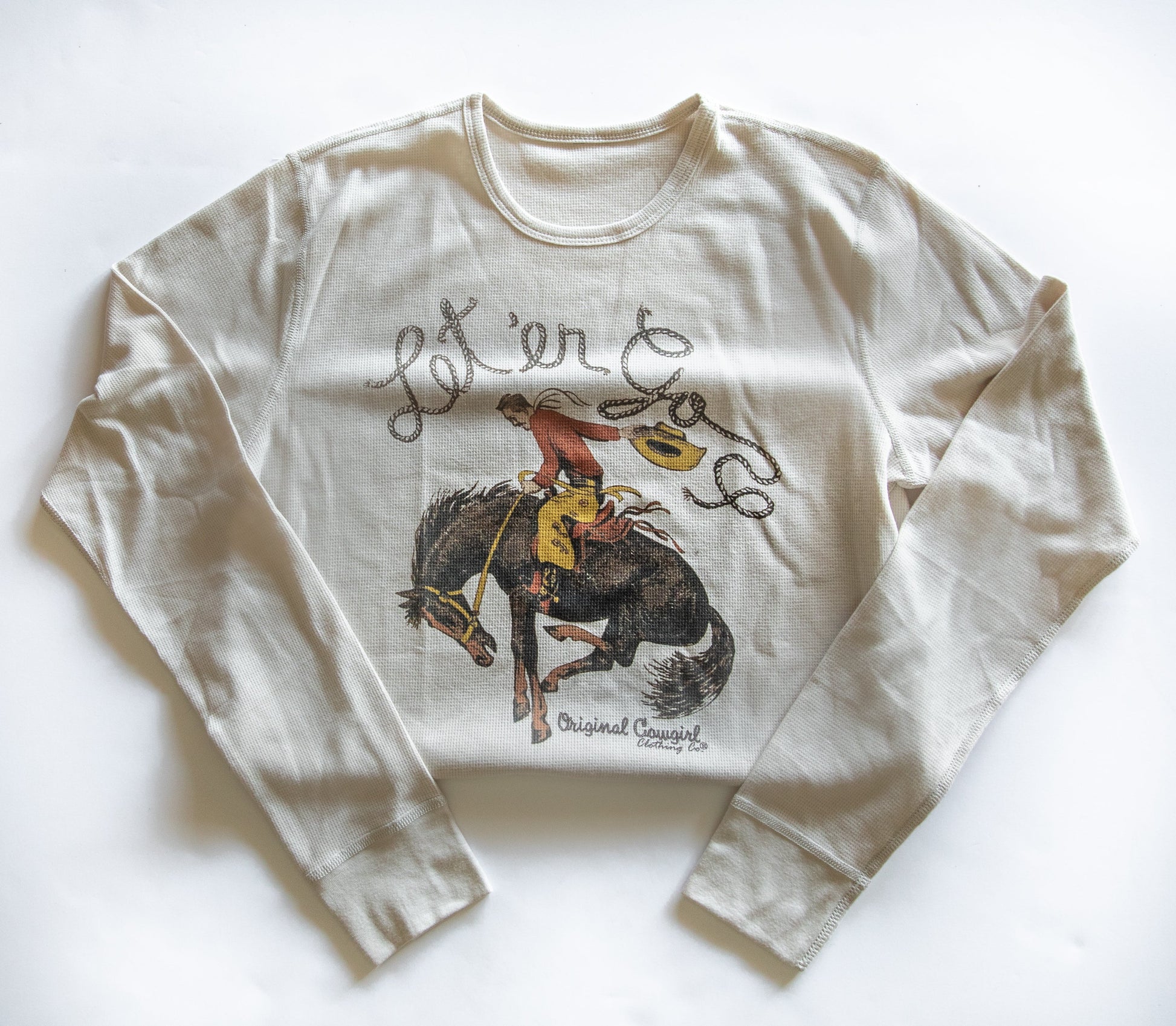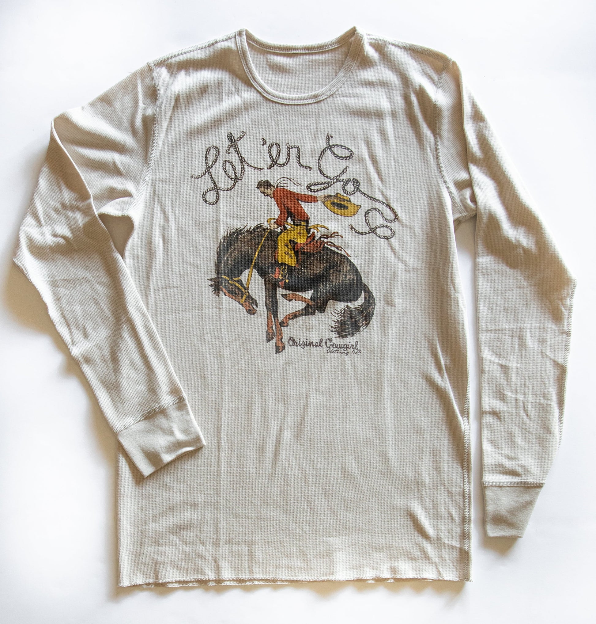 This comfortable waffle knit thermal is crafted from soft cotton and features long sleeves and a crew neckline all with the signature Original Cowgirl style. Soft and cozy for chilly days, perfect weight to layer under our favorite shirt or vest.