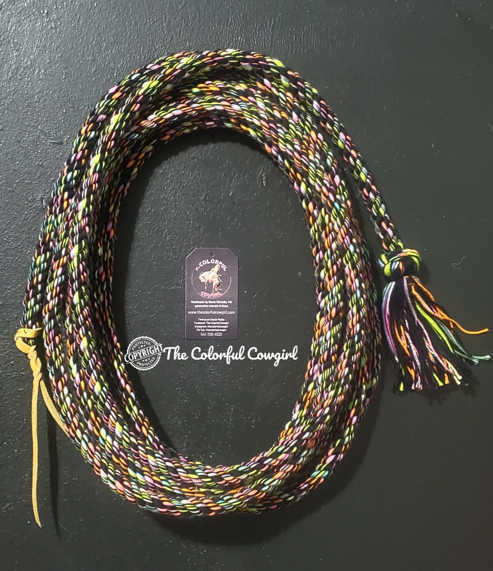 Gorgeous five eighths cotton mecate in mixed black and neon colors. Can be finished to the length you would like. Please allow 1-2 weeks turn around time.