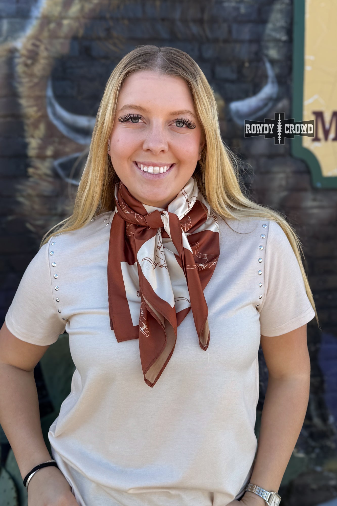 The RUST Checkered Skull Wild Rag adds a clean, modern twist to classic western style. Featuring a bold rust-and-cream checkered pattern covered in longhorn skull outlines, this silky wild rag is the perfect mix of punchy and polished. Soft, lightweight, and easy to tie, it elevates any outfit- from rodeo tees to dressy denim and turquoise.