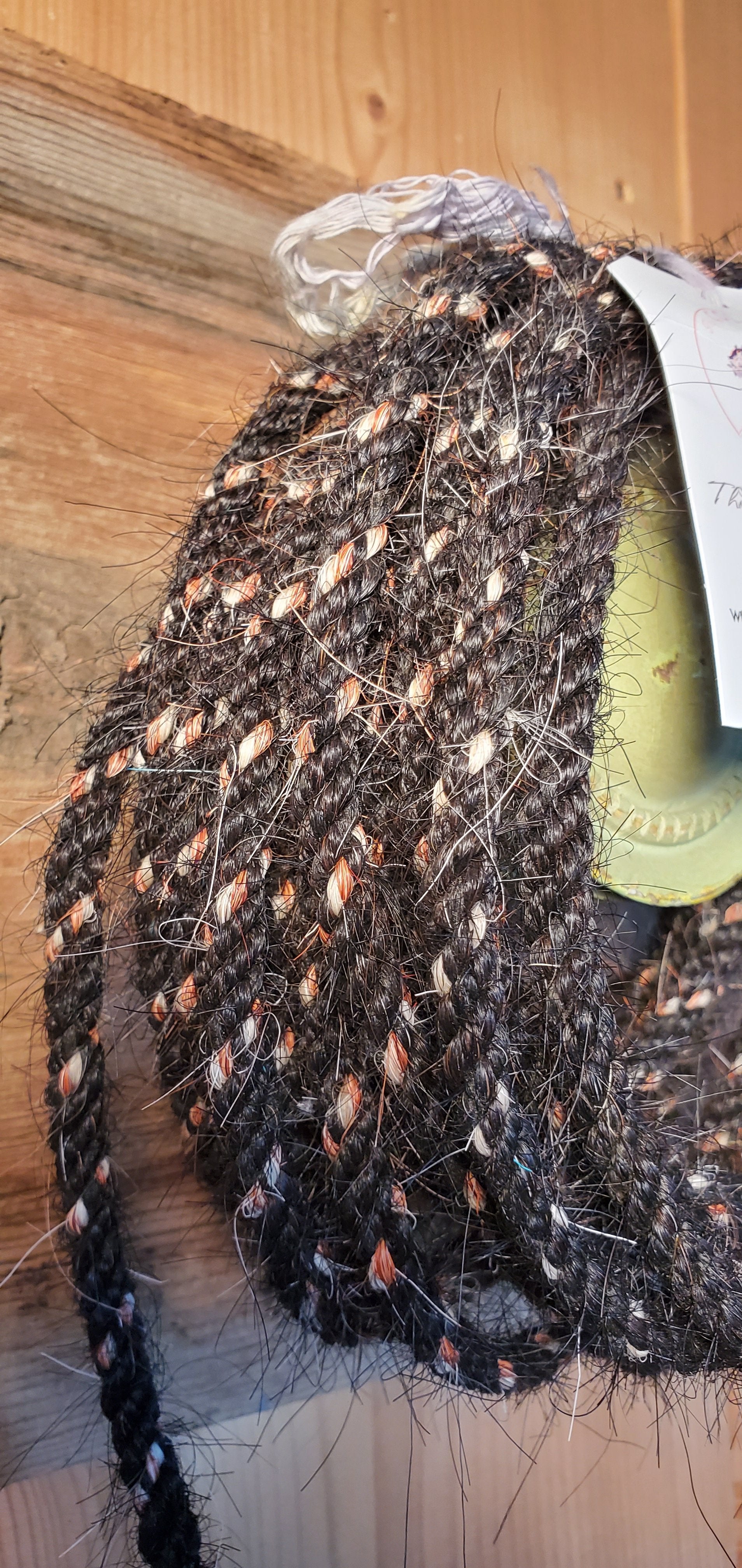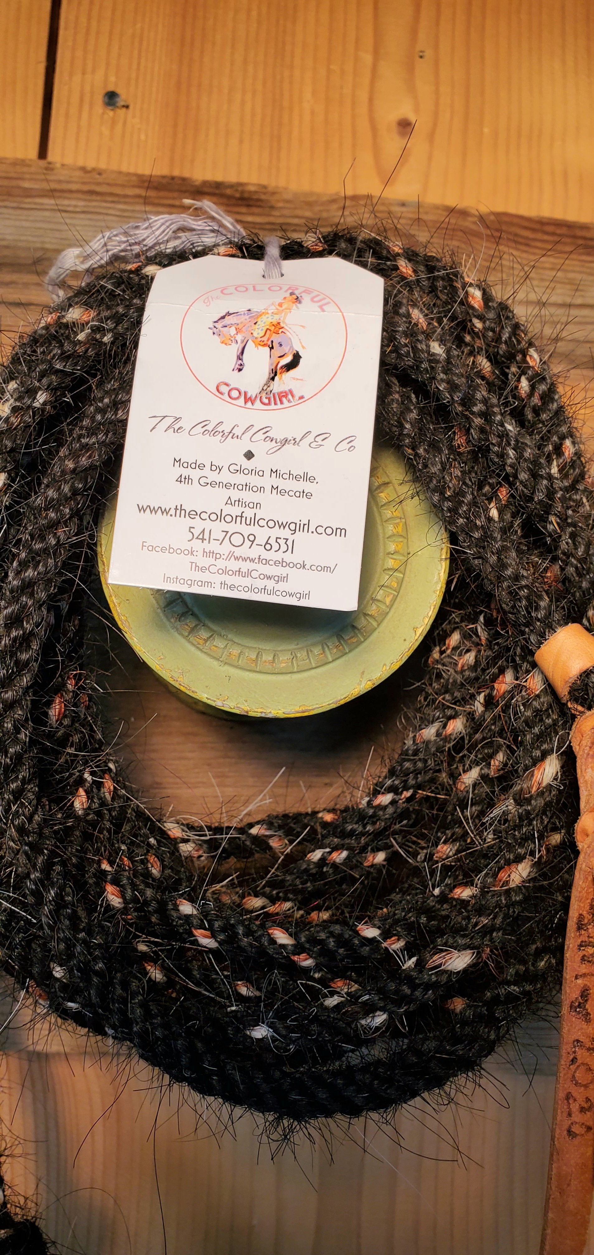 Traditional snake eye pattern Mecate in black mane hair with rust, and white