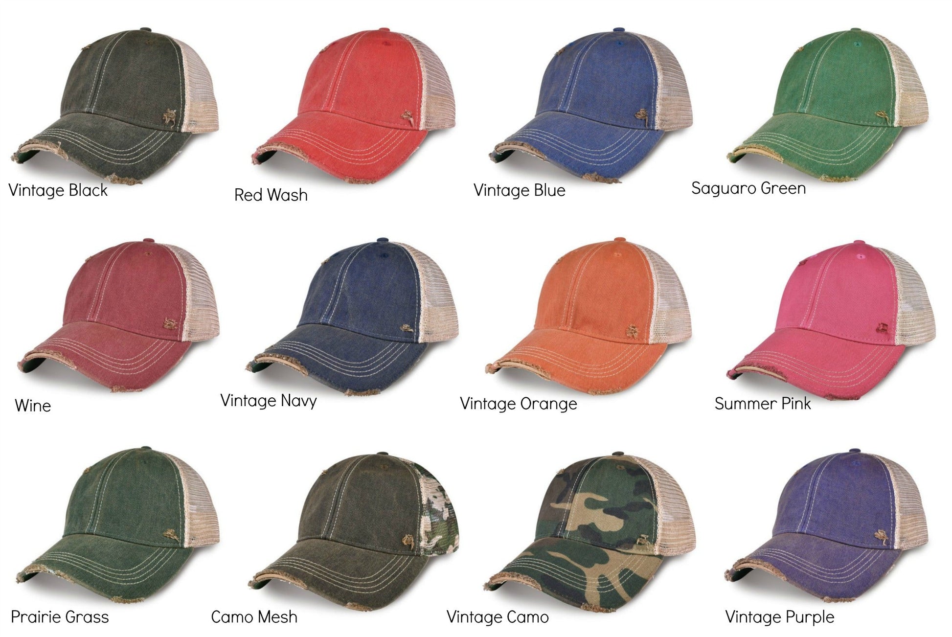 Classic vintage style with soft mesh back with embroidered patch and distressed contrast stitching on distressed vintage look canvas.