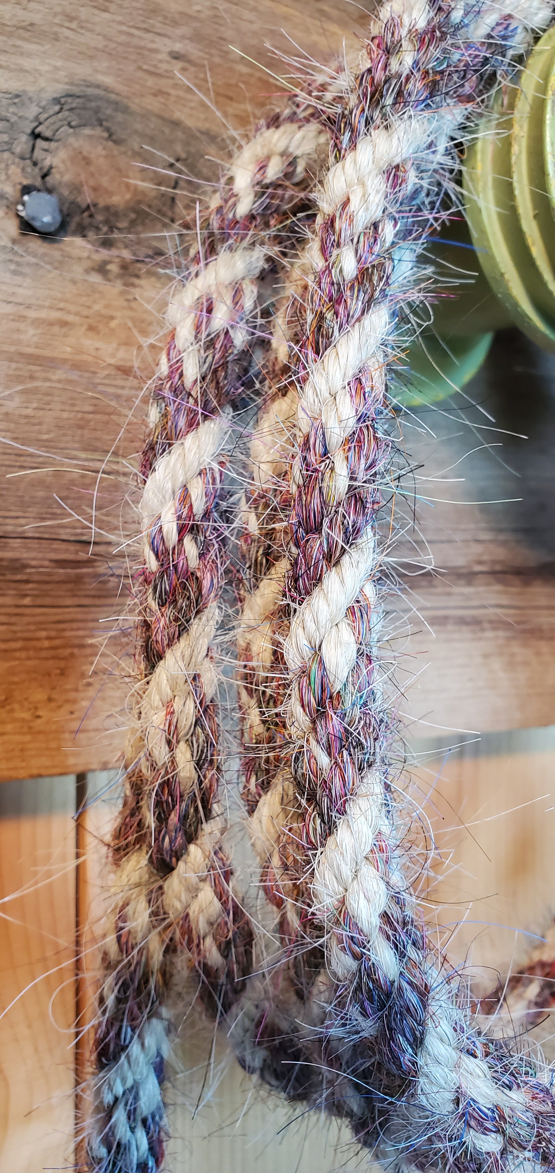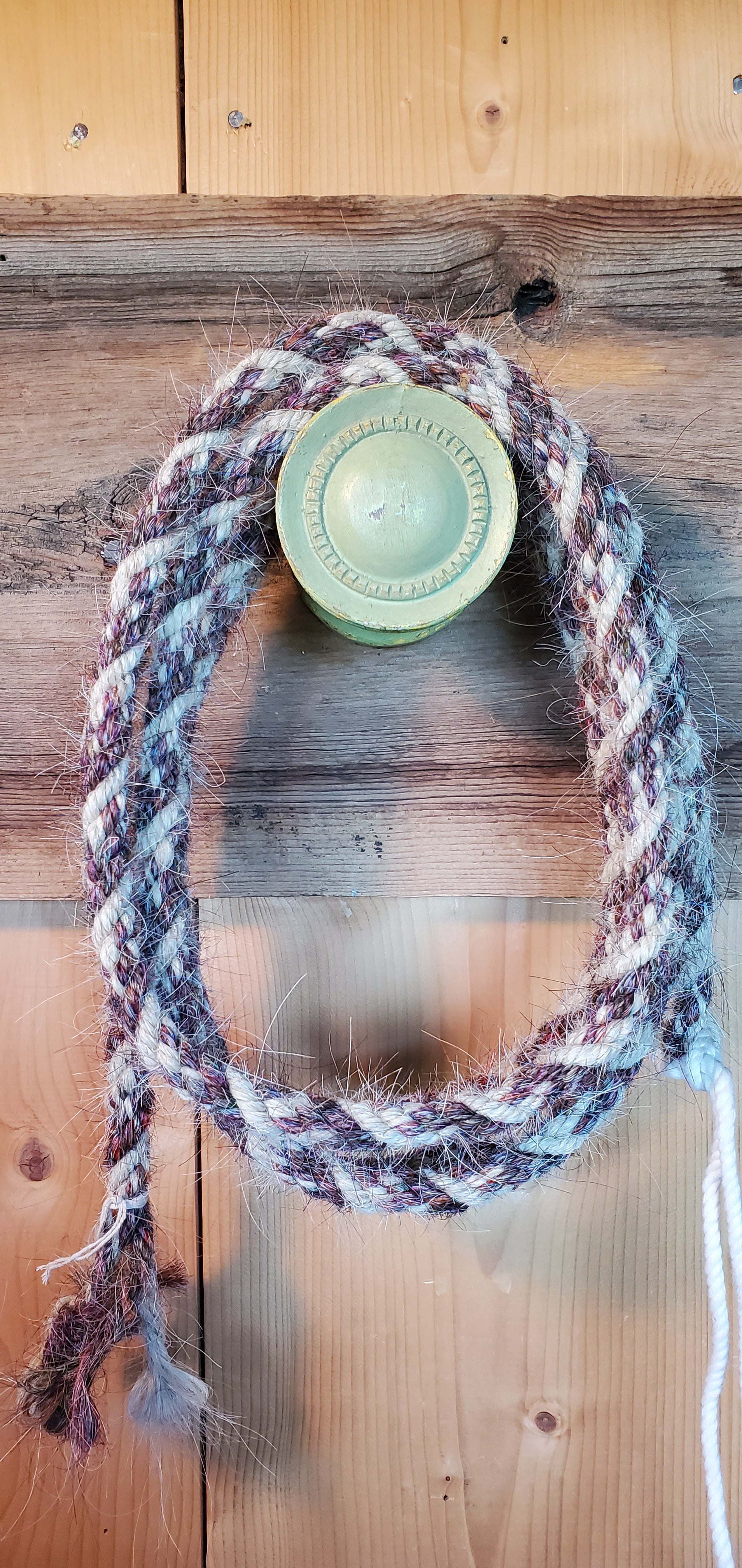 5/8 mane hair single loop rein mainly white with a mix of pinks, and soft reds in a traditional pattern.