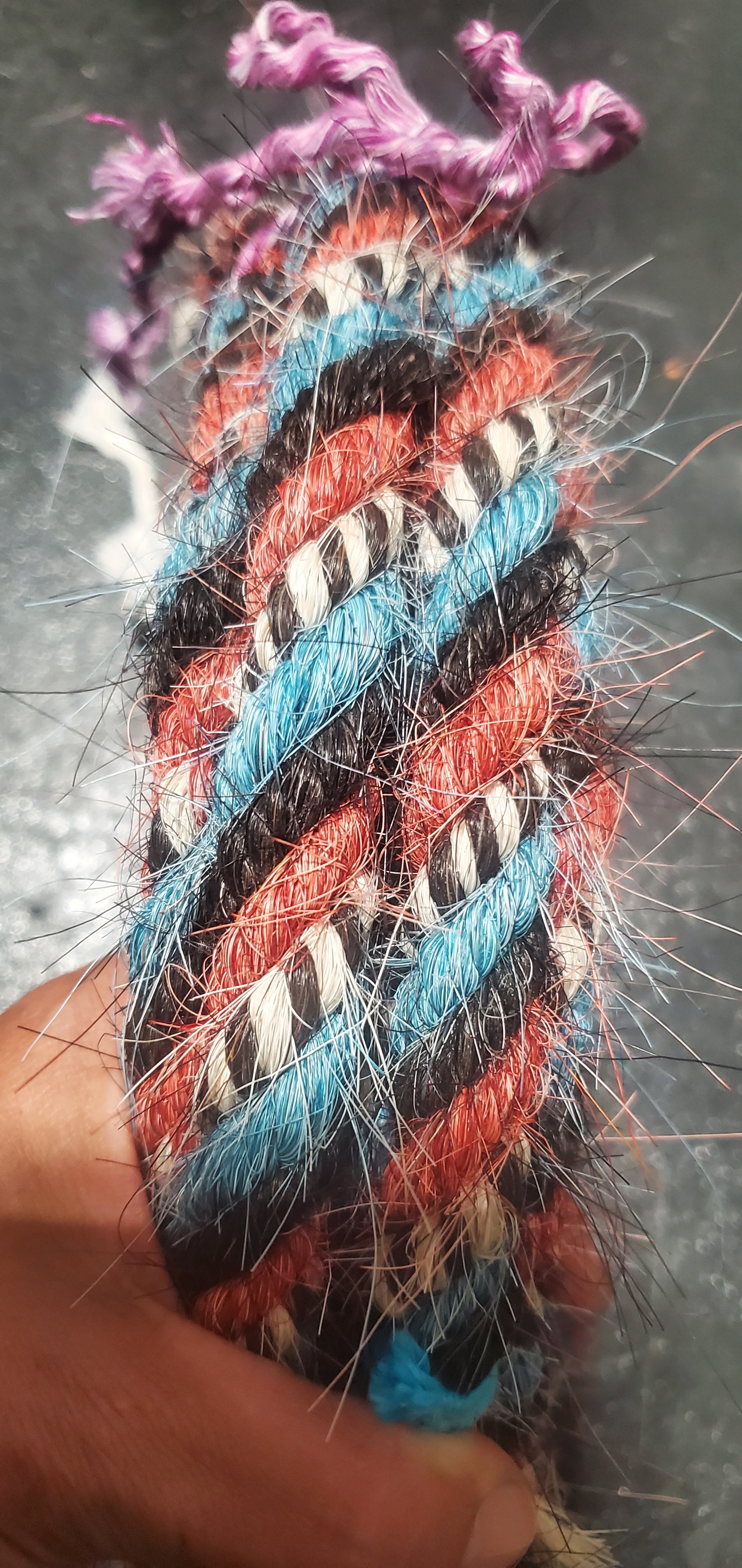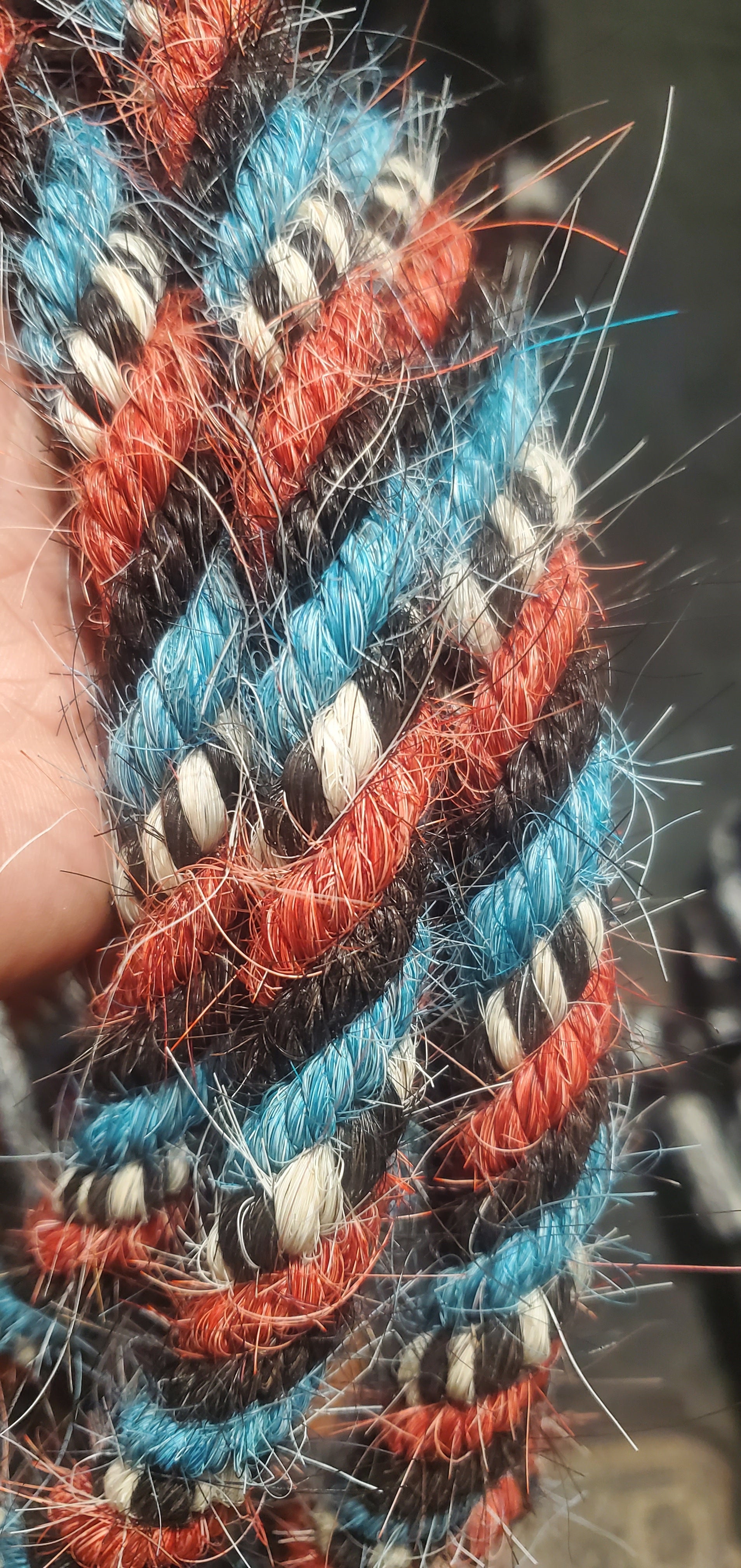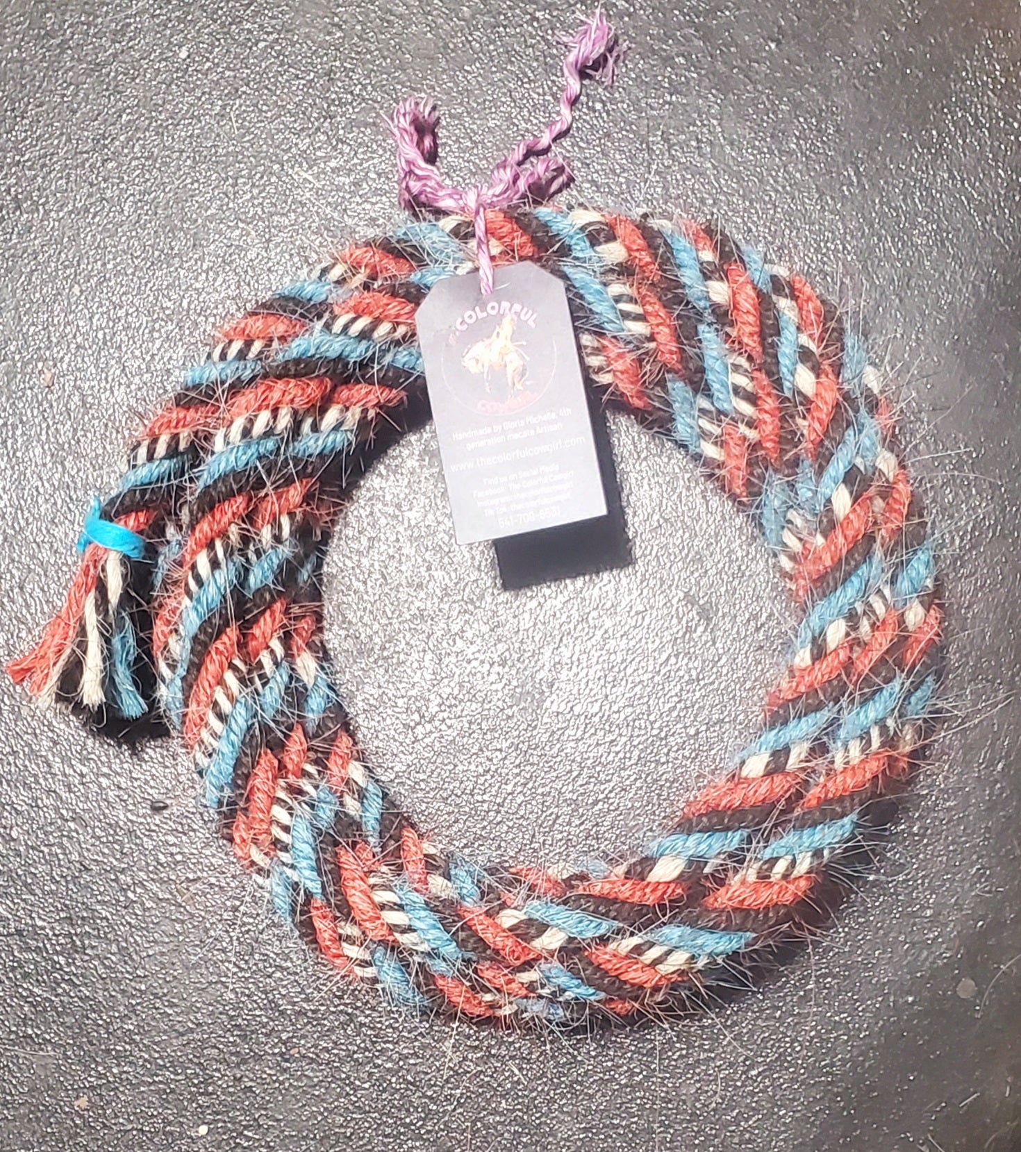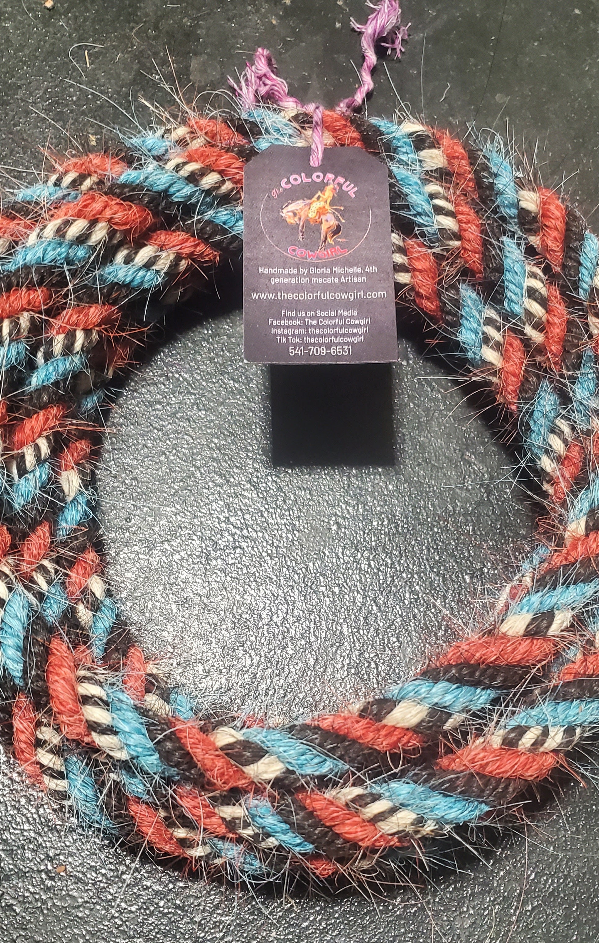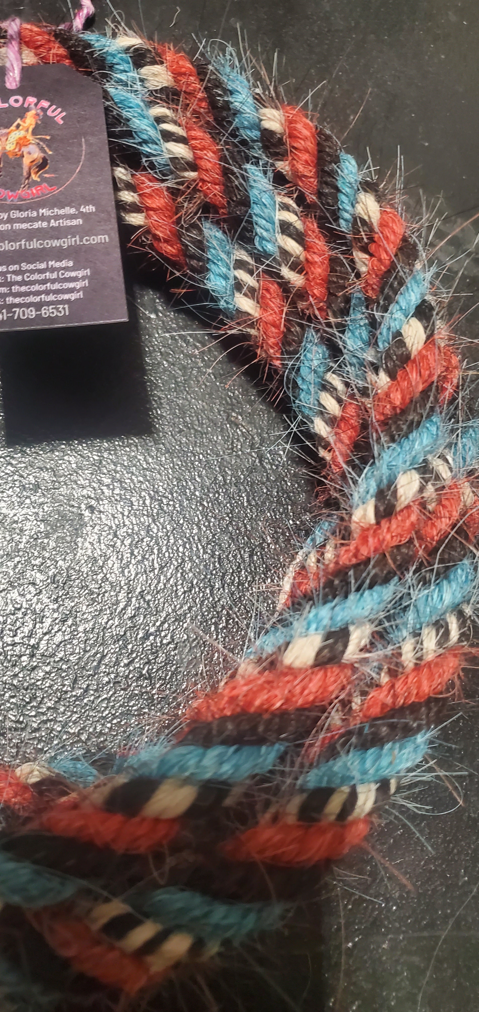 Gorgeous mane hair loop rein that encapsulates the Spirit of the West in black, turquoise, red, black and white. 5/8 in diameter, and can be finished to the length you want up to 12'.