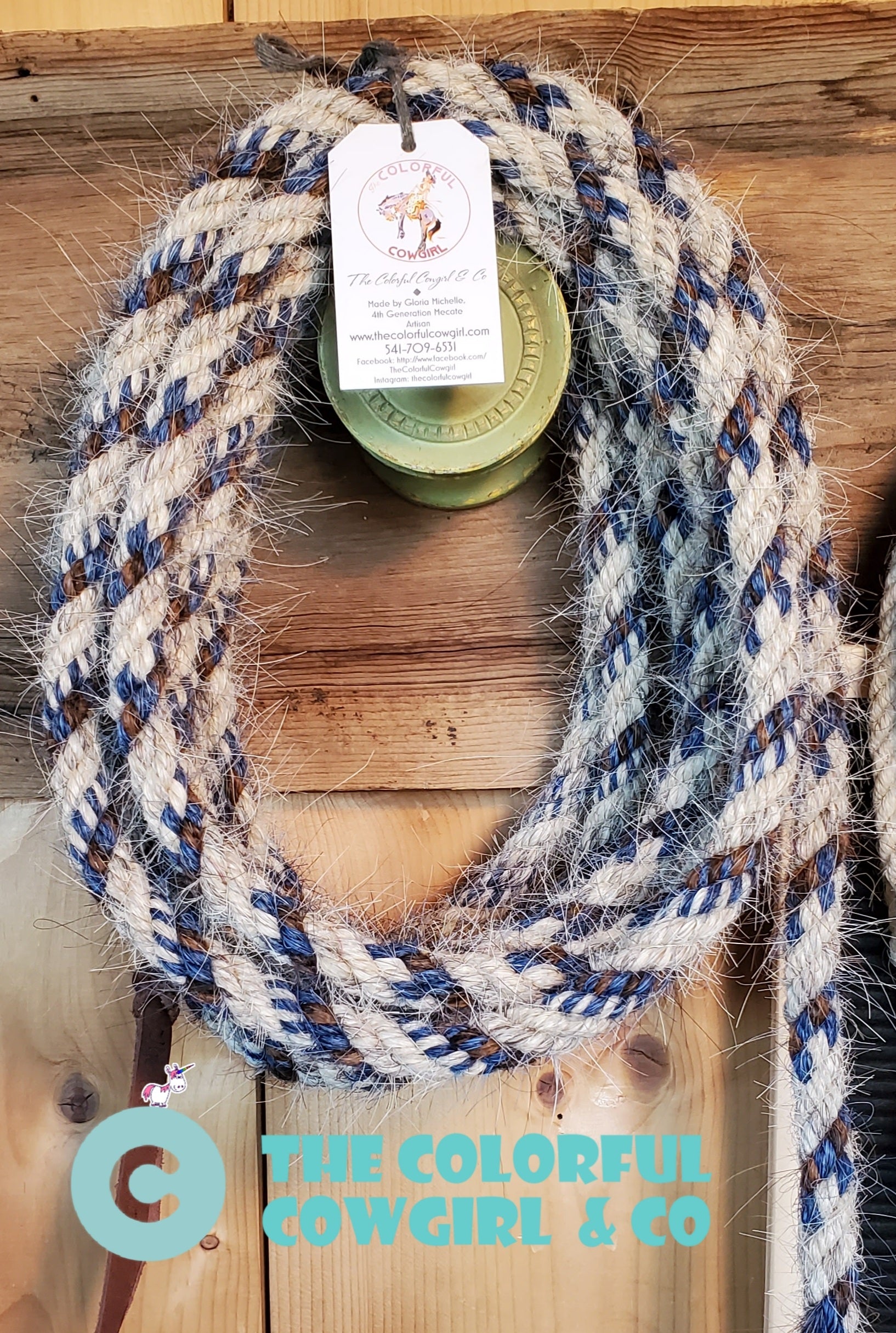Gorgeous mane hair mecate in silver grey, white, with hints of royal blue, and sorrel.