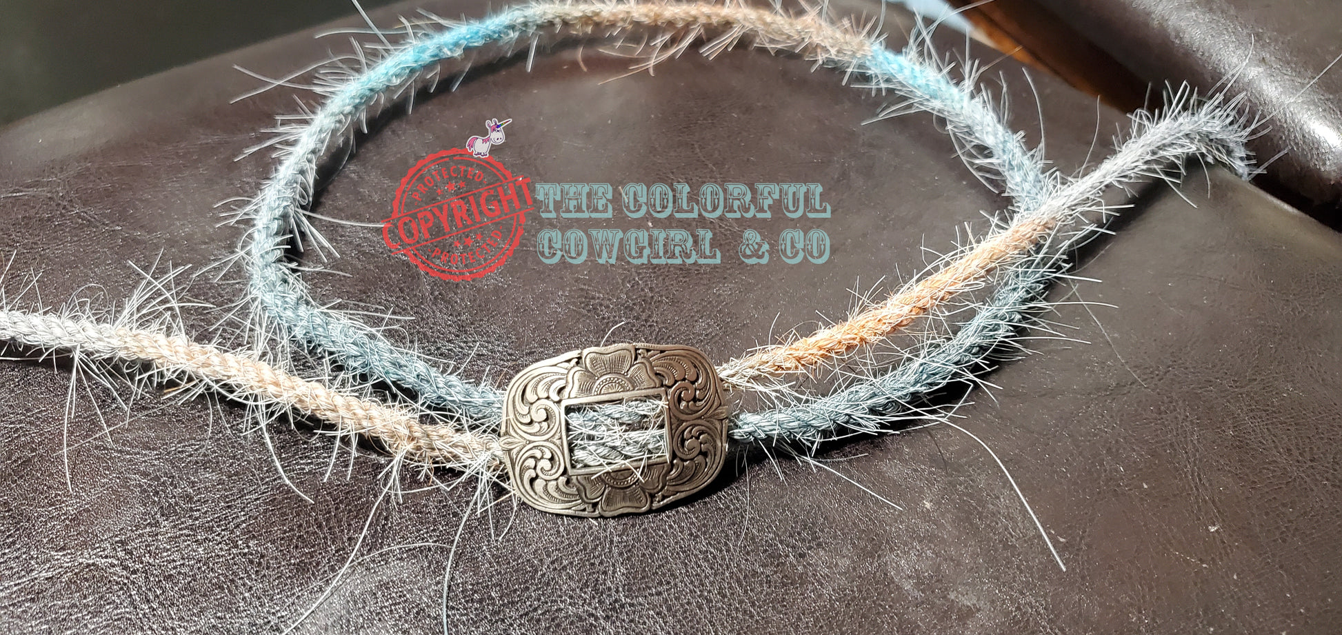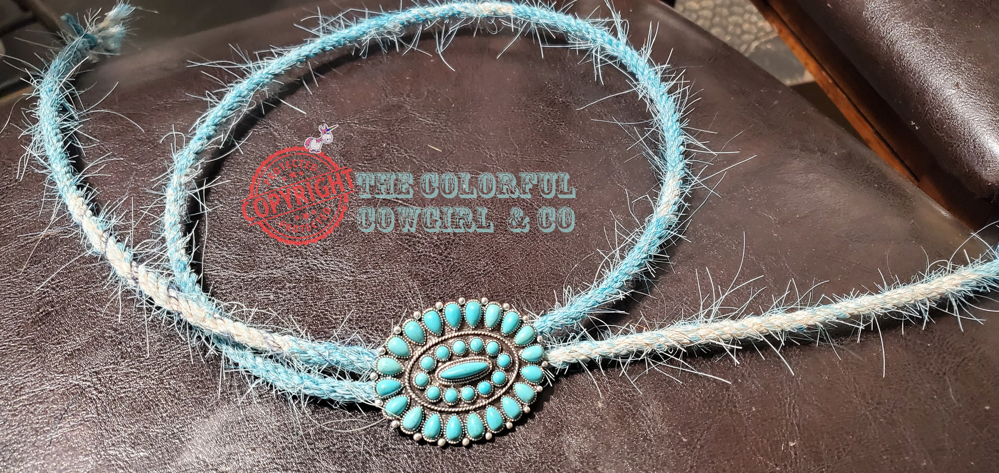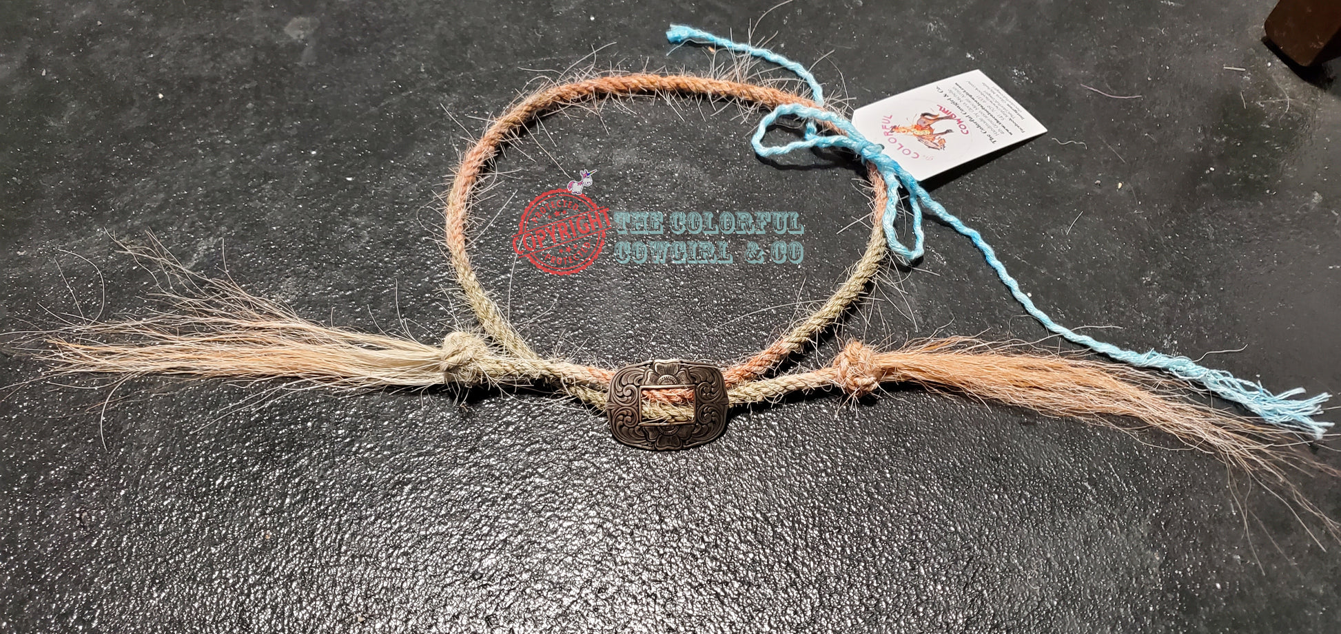 Gorgeous mane hair mecate hatbands tie dyed, and finished with Mincer buckles, turquoise etc.