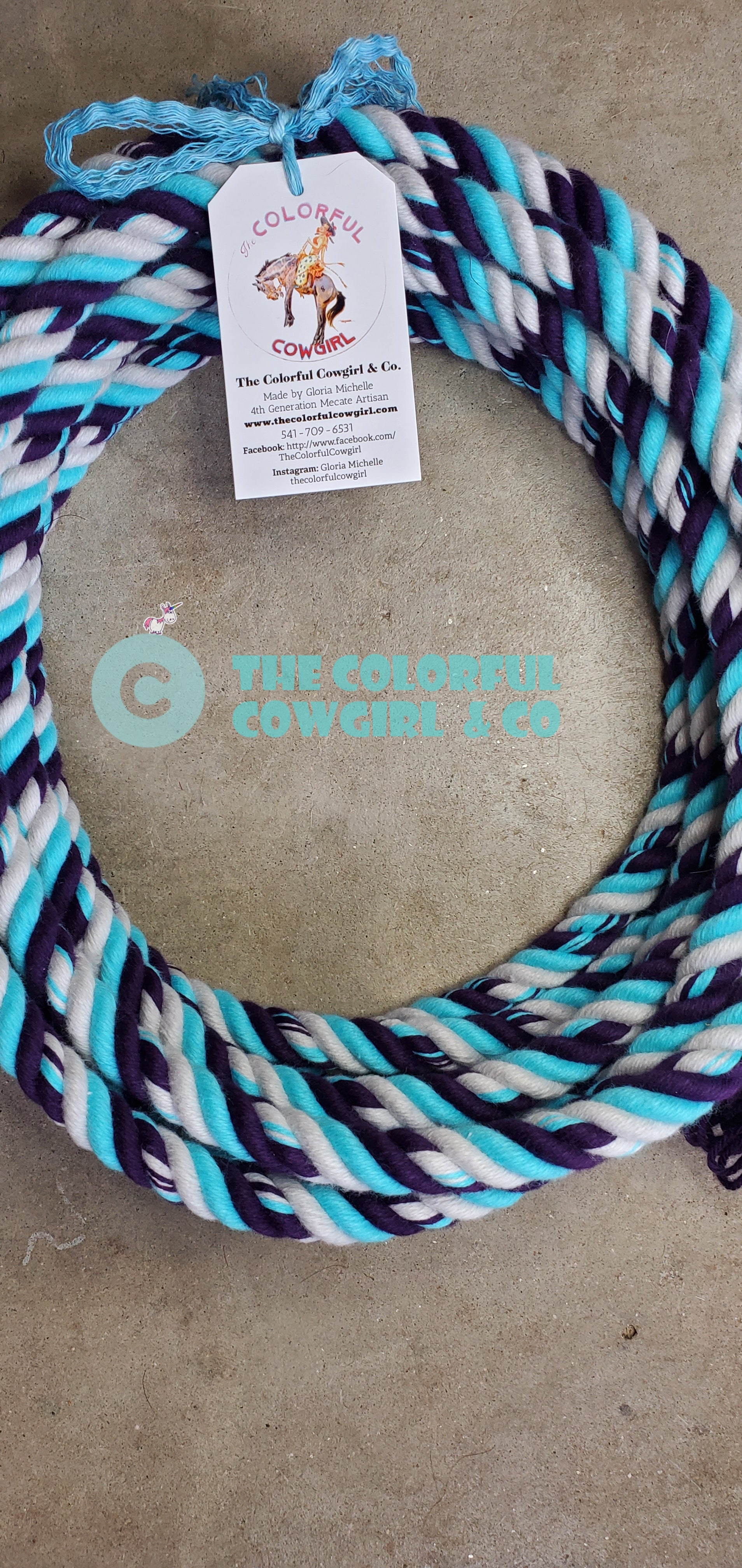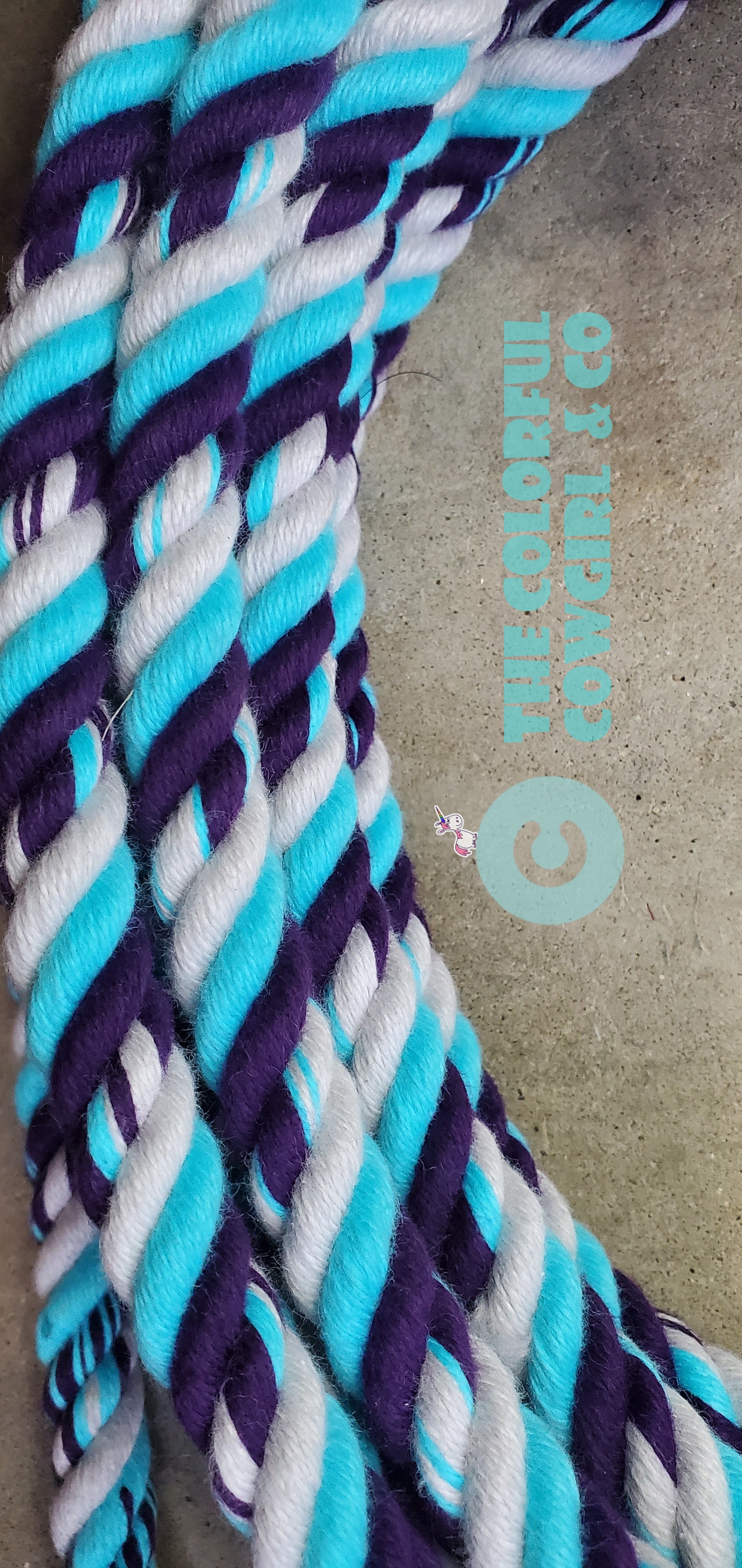 Gorgeous cotton mecate in five eighths. Finish to the length you want. Turquoise, Eggplant Purple, and Silver Grey