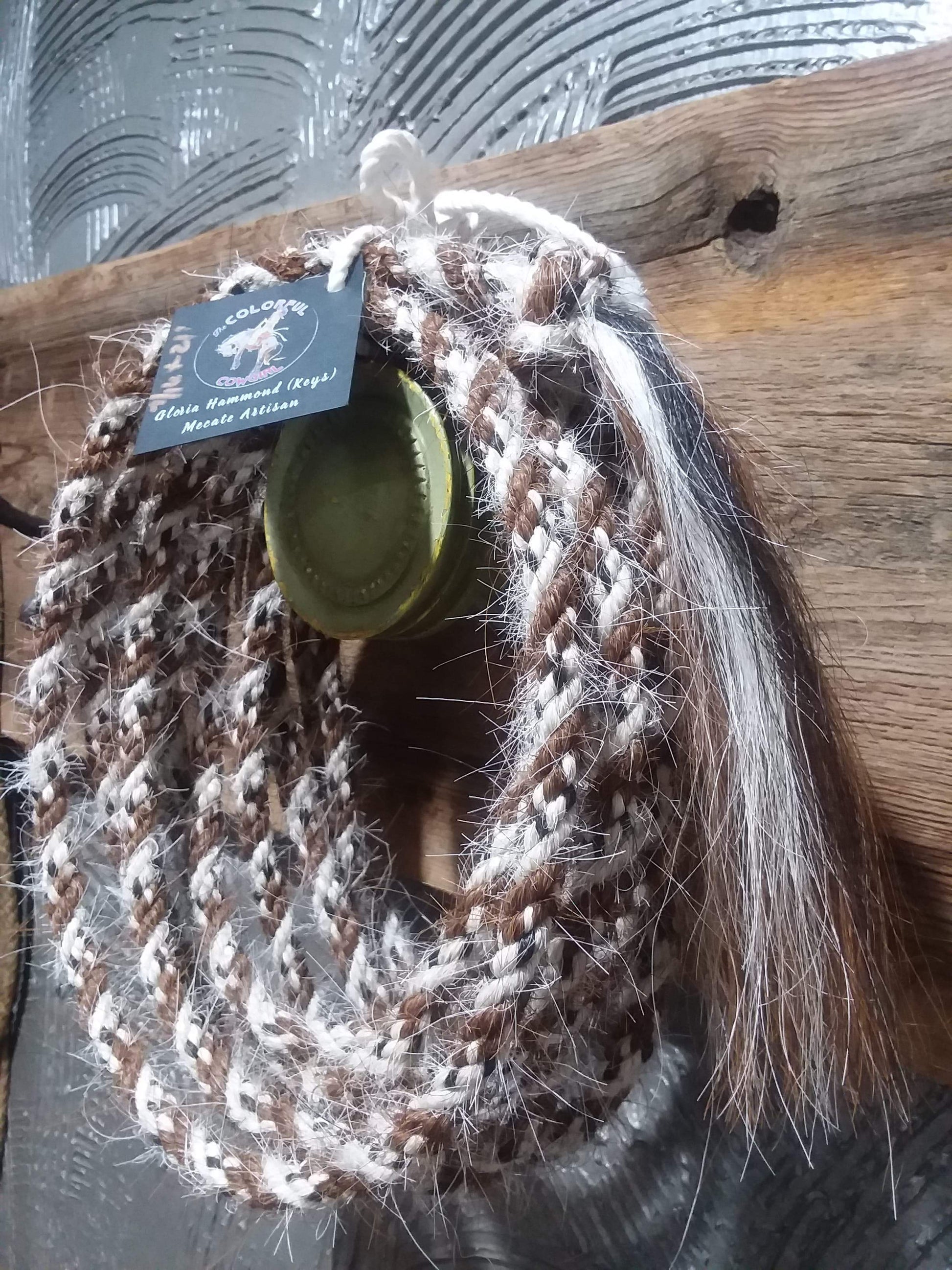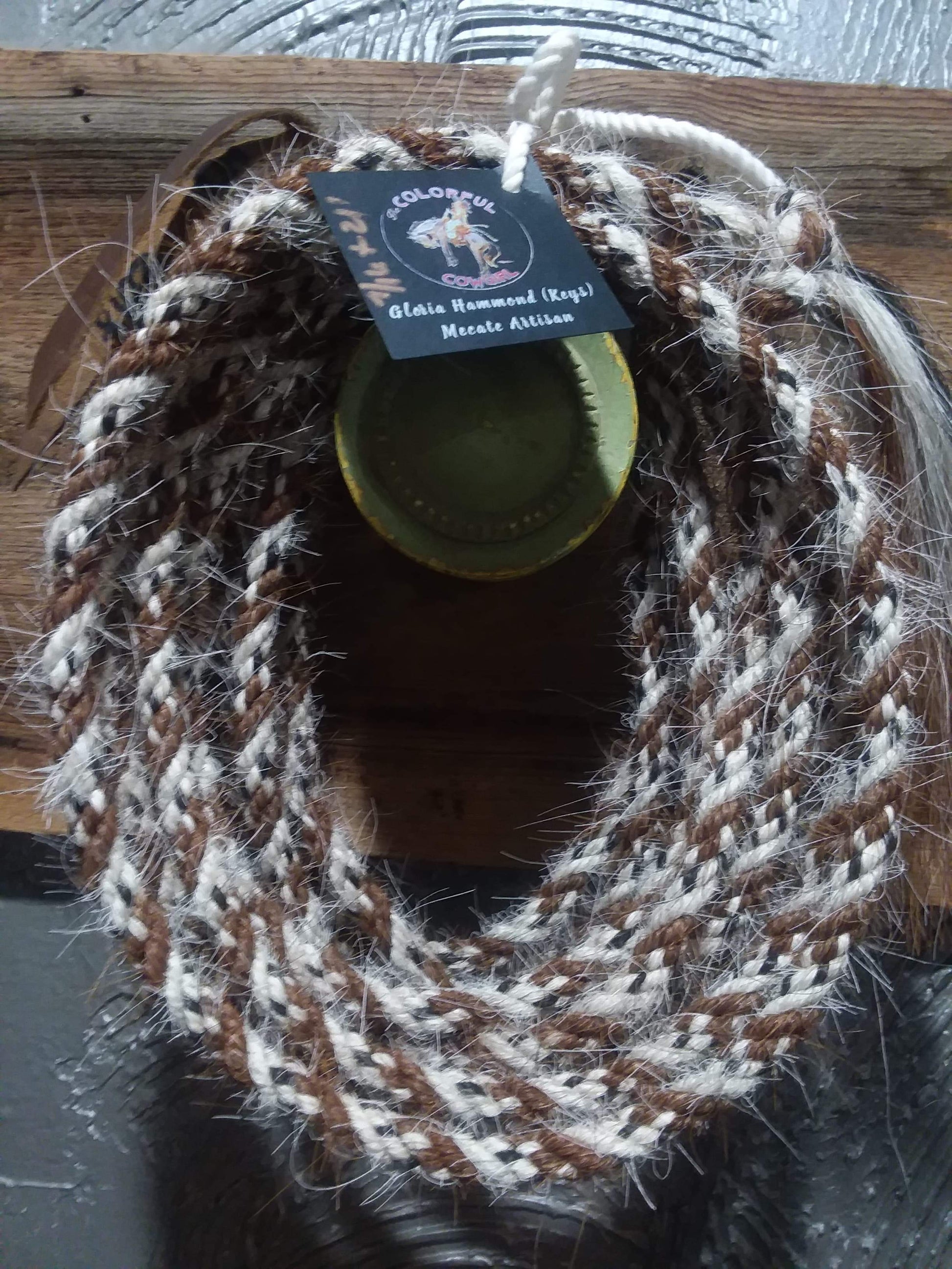 Beautiful traditional pattern mecate in a natural red sorrel, and white with a black snake eye. 7/16" x 21' (scant 1/2"). Made by 3rd generation artisan Helen Dougal, The Colorful Cowgirls Mom.