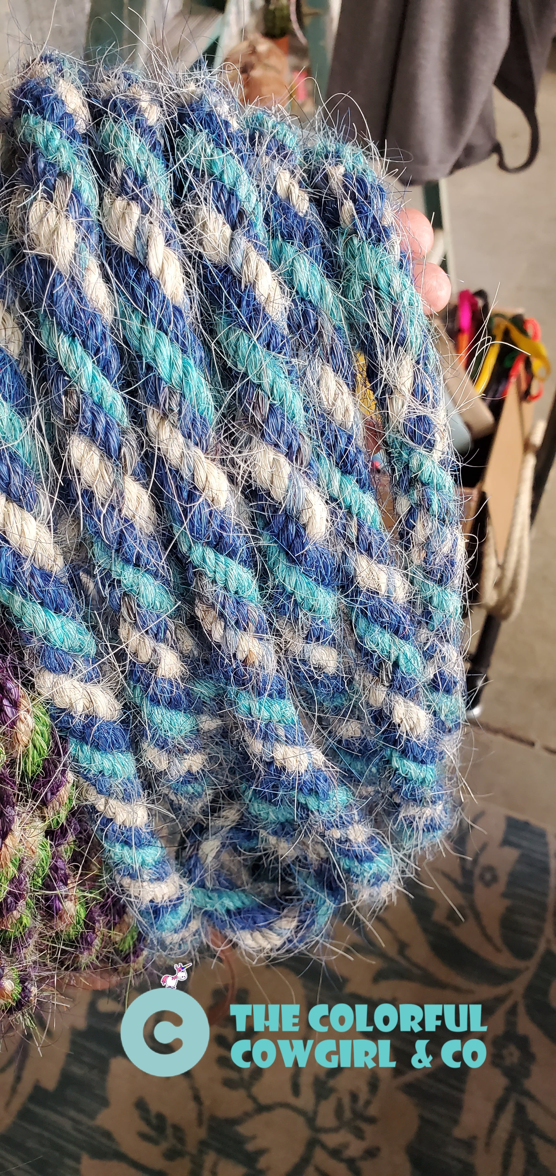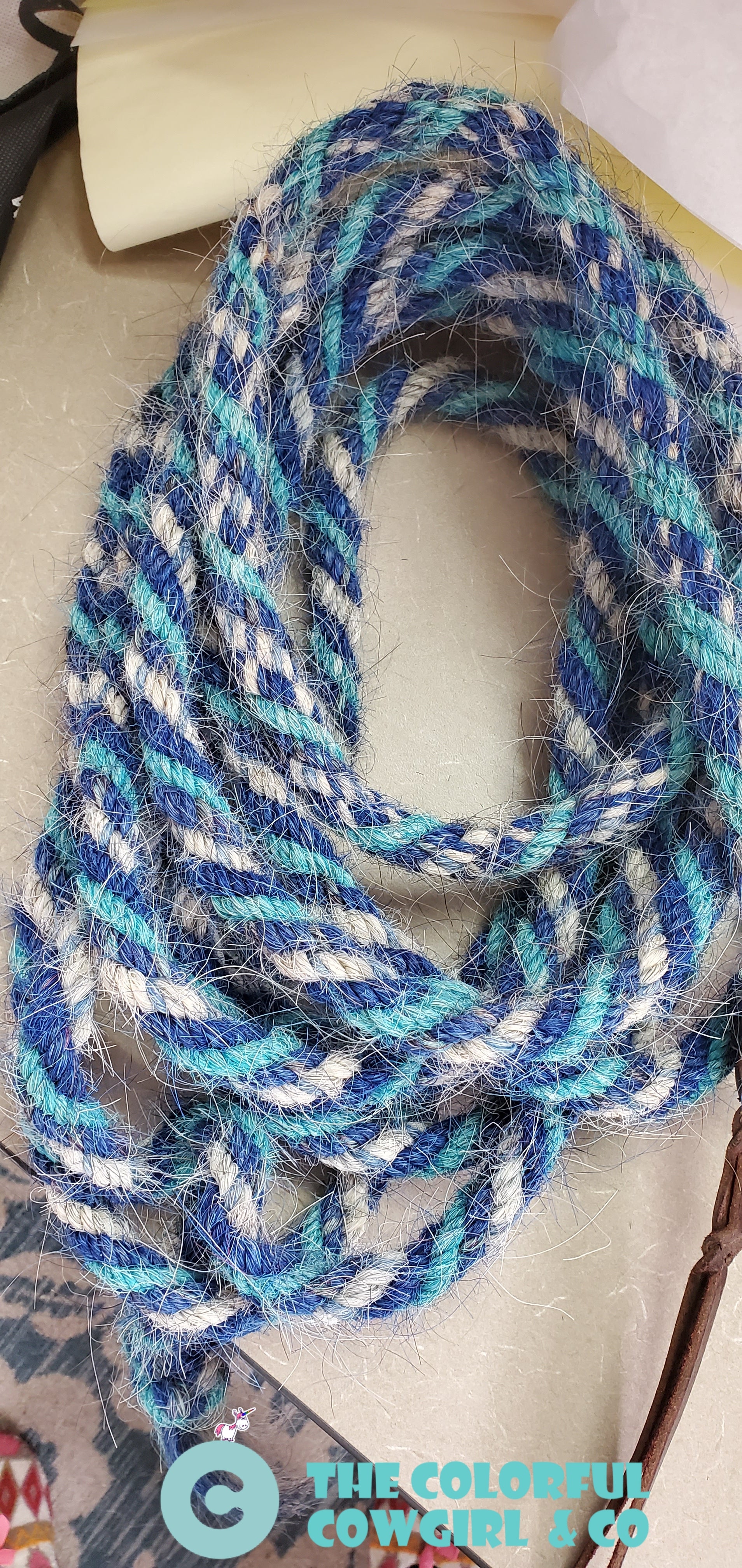 Used Colorful Cowgirl mecate. 5/8", broke in, soft, and raggy! Has been tied on a snaffle bit. Turquoise, Royal Blue, and White
